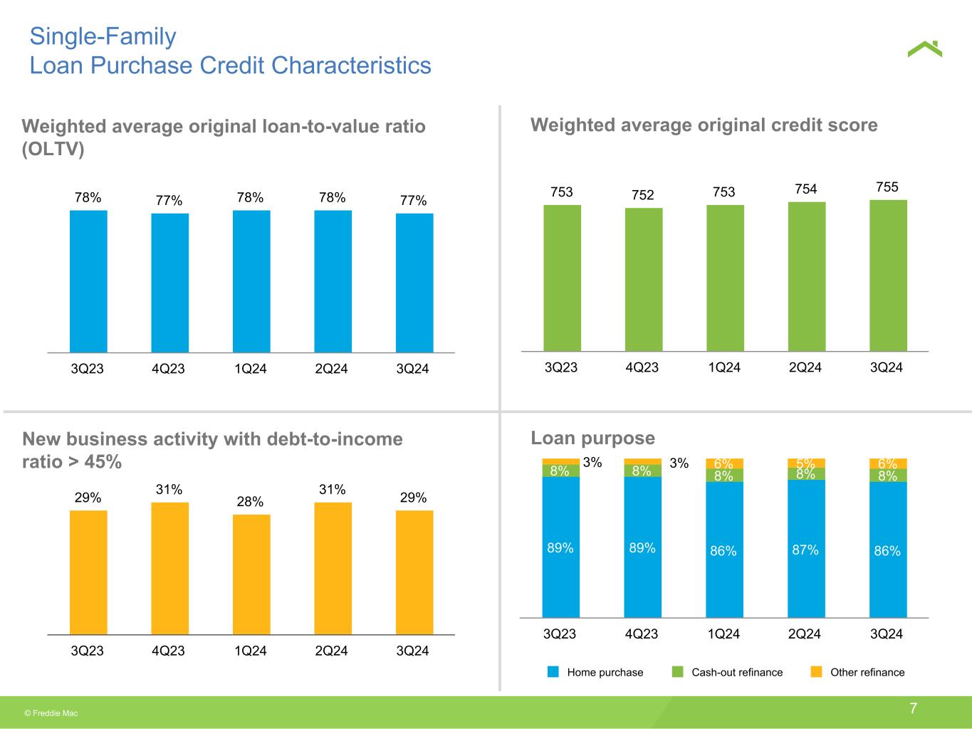 © Freddie Mac 6 $3,024 $3,039 $3,043 $3,058 $3,082 3Q23 4Q23 1Q24 2Q24 3Q24 0.99% 1.10% 0.96% 1.12% 1.05% 0.24% 0.27% 0.24% 0.25% 0.27% 0.55% 0.55% 0.52% 0.50% 0.54% One month past due Two months past due Seriously delinquent 3Q23 4Q23 1Q24 2Q24 3Q24 $85 $73 $62 $85 $98 $76 $65 $53 $74 $84 $9 $8 $9 $11 $14 55 56 55 54 57 Home purchase Refinance 3Q23 4Q23 1Q24 2Q24 3Q24 Single-Family Financial Highlights and Key Metrics $4.9 $4.8 $4.5 $5.1 $5.1 $2.3 $2.7 $1.9 $2.3 $2.6 Net revenues Net income 3Q23 4Q23 1Q24 2Q24 3Q24 Net revenues and net income $ Billions 2% YoY increase Mortgage portfolio UPB in $ Billions Average estimated guarantee fee rate on new acquisitions (bps)4 Delinquency rates New business activity UPB in $ Billions