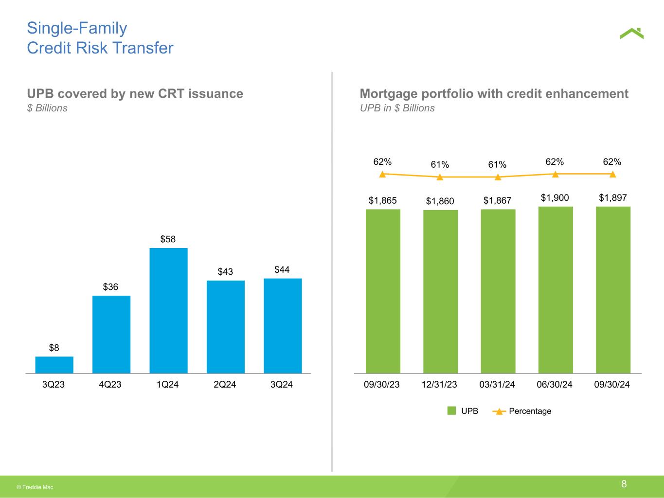 © Freddie Mac 7 78% 77% 78% 78% 77% 3Q23 4Q23 1Q24 2Q24 3Q24 89% 89% 86% 87% 86% 8% 8% 8% 8% 8% 6% 5% 6% Home purchase Cash-out refinance Other refinance 3Q23 4Q23 1Q24 2Q24 3Q24 753 752 753 754 755 3Q23 4Q23 1Q24 2Q24 3Q24 29% 31% 28% 31% 29% 3Q23 4Q23 1Q24 2Q24 3Q24 New business activity with debt-to-income ratio > 45% Weighted average original loan-to-value ratio (OLTV) Weighted average original credit score Single-Family Loan Purchase Credit Characteristics Loan purpose 3% 3%