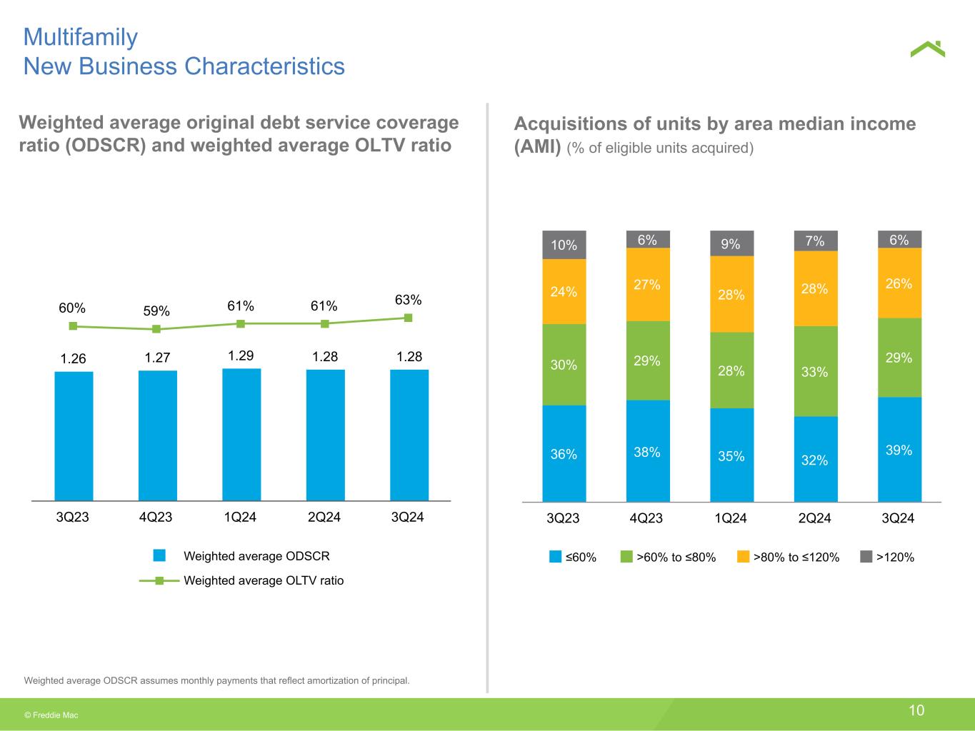 © Freddie Mac 9 $13 $16 $9 $11 $15 3Q23 4Q23 1Q24 2Q24 3Q24 0.24% 0.39% 0.29% 0.50%0.57% 1.21% Freddie Mac (60+ day) FDIC insured institutions (90+ day) MF CMBS market (60+ day) 3Q23 4Q23 1Q24 2Q24 3Q24 Multifamily delinquency rates $432 $441 $443 $447 $452 3Q23 4Q23 1Q24 2Q24 3Q24 Multifamily Financial Highlights and Key Metrics $0.8 $0.6 $1.3 $0.9 $0.8 $0.4 $0.3 $0.8 $0.5 $0.5 Net revenues Net income 3Q23 4Q23 1Q24 2Q24 3Q24 (89 %) New business activity UPB in $ Billions 5% YoY increase The delinquency rate for FDIC insured institutions is as of June 30, 2024 (latest available information). Mortgage portfolio UPB in $ Billions Net revenues and net income $ Billions