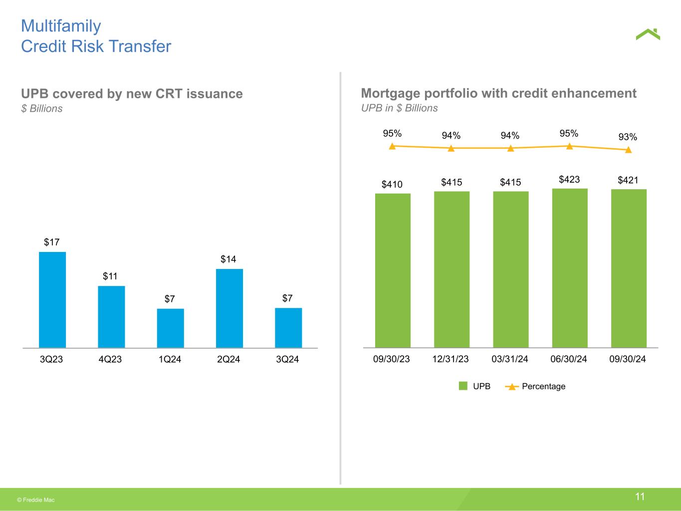 © Freddie Mac 10 Acquisitions of units by area median income (AMI) (% of eligible units acquired) 36% 38% 35% 32% 39% 30% 29% 28% 33% 29% 24% 27% 28% 28% 26% 10% 6% 9% 7% 6% ≤60% >60% to ≤80% >80% to ≤120% >120% 3Q23 4Q23 1Q24 2Q24 3Q24 Weighted average ODSCR assumes monthly payments that reflect amortization of principal. 1.26 1.27 1.29 1.28 1.28 60% 59% 61% 61% 63% Weighted average ODSCR Weighted average OLTV ratio 3Q23 4Q23 1Q24 2Q24 3Q24 Multifamily New Business Characteristics (89 %) Weighted average original debt service coverage ratio (ODSCR) and weighted average OLTV ratio