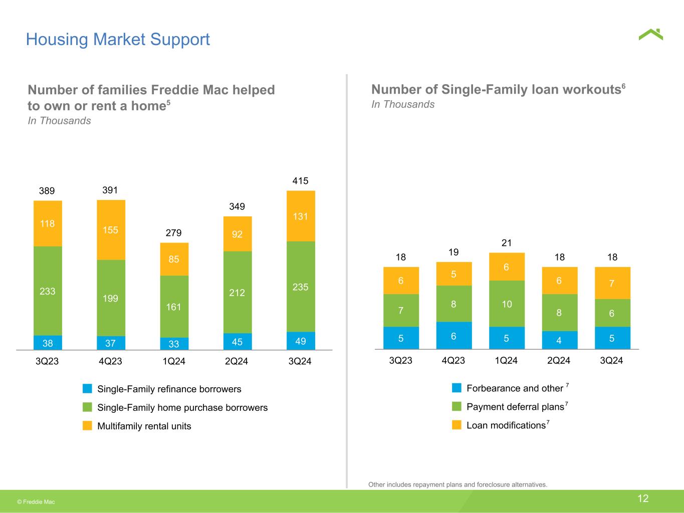© Freddie Mac 12 18 19 21 18 18 5 6 5 4 5 7 8 10 8 6 6 5 6 6 7 Forbearance and other Payment deferral plans Loan modifications 3Q23 4Q23 1Q24 2Q24 3Q24 Number of families Freddie Mac helped to own or rent a home5 In Thousands Housing Market Support 389 391 279 349 415 38 37 33 45 49 233 199 161 212 235 118 155 85 92 131 Single-Family refinance borrowers Single-Family home purchase borrowers Multifamily rental units 3Q23 4Q23 1Q24 2Q24 3Q24 Other includes repayment plans and foreclosure alternatives. 7 Number of Single-Family loan workouts6 In Thousands 7 7