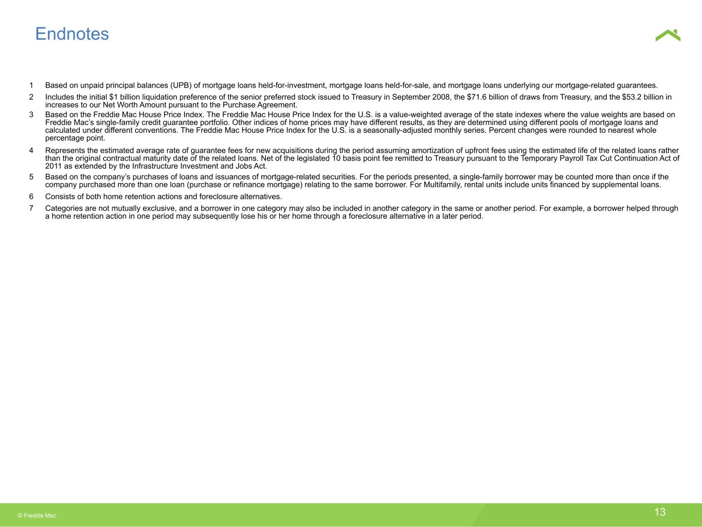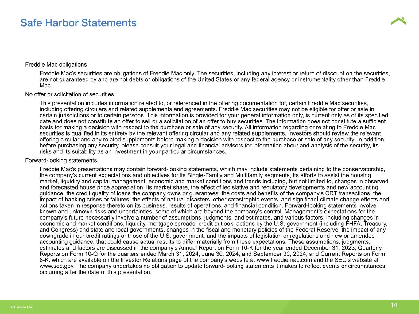 © Freddie Mac 13 Endnotes 1 Based on unpaid principal balances (UPB) of mortgage loans held-for-investment, mortgage loans held-for-sale, and mortgage loans underlying our mortgage-related guarantees. 2 Includes the initial $1 billion liquidation preference of the senior preferred stock issued to Treasury in September 2008, the $71.6 billion of draws from Treasury, and the $53.2 billion in increases to our Net Worth Amount pursuant to the Purchase Agreement. 3 Based on the Freddie Mac House Price Index. The Freddie Mac House Price Index for the U.S. is a value-weighted average of the state indexes where the value weights are based on Freddie Mac’s single-family credit guarantee portfolio. Other indices of home prices may have different results, as they are determined using different pools of mortgage loans and calculated under different conventions. The Freddie Mac House Price Index for the U.S. is a seasonally-adjusted monthly series. Percent changes were rounded to nearest whole percentage point. 4 Represents the estimated average rate of guarantee fees for new acquisitions during the period assuming amortization of upfront fees using the estimated life of the related loans rather than the original contractual maturity date of the related loans. Net of the legislated 10 basis point fee remitted to Treasury pursuant to the Temporary Payroll Tax Cut Continuation Act of 2011 as extended by the Infrastructure Investment and Jobs Act. 5 Based on the company’s purchases of loans and issuances of mortgage-related securities. For the periods presented, a single-family borrower may be counted more than once if the company purchased more than one loan (purchase or refinance mortgage) relating to the same borrower. For Multifamily, rental units include units financed by supplemental loans. 6 Consists of both home retention actions and foreclosure alternatives. 7 Categories are not mutually exclusive, and a borrower in one category may also be included in another category in the same or another period. For example, a borrower helped through a home retention action in one period may subsequently lose his or her home through a foreclosure alternative in a later period.