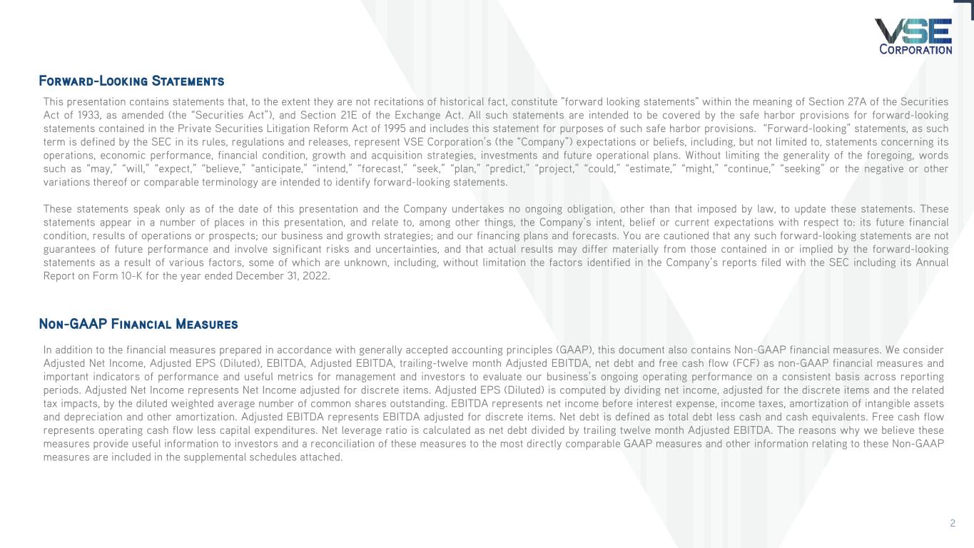 This presentation contains statements that, to the extent they are not recitations of historical fact, constitute "forward looking statements" within the meaning of Section 27A of the Securities Act of 1933, as amended (the “Securities Act”), and Section 21E of the Exchange Act. All such statements are intended to be covered by the safe harbor provisions for forward-looking statements contained in the Private Securities Litigation Reform Act of 1995 and includes this statement for purposes of such safe harbor provisions. “Forward-looking” statements, as such term is defined by the SEC in its rules, regulations and releases, represent VSE Corporation’s (the “Company”) expectations or beliefs, including, but not limited to, statements concerning its operations, economic performance, financial condition, growth and acquisition strategies, investments and future operational plans. Without limiting the generality of the foregoing, words such as “may,” “will,” “expect,” “believe,” “anticipate,” “intend,” “forecast,” “seek,” “plan,” “predict,” “project,” “could,” “estimate,” “might,” “continue,” “seeking” or the negative or other variations thereof or comparable terminology are intended to identify forward-looking statements. These statements speak only as of the date of this presentation and the Company undertakes no ongoing obligation, other than that imposed by law, to update these statements. These statements appear in a number of places in this presentation, and relate to, among other things, the Company’s intent, belief or current expectations with respect to: its future financial condition, results of operations or prospects; our business and growth strategies; and our financing plans and forecasts. You are cautioned that any such forward-looking statements are not guarantees of future performance and involve significant risks and uncertainties, and that actual results may differ materially from those contained in or implied by the forward-looking statements as a result of various factors, some of which are unknown, including, without limitation the factors identified in the Company’s reports filed with the SEC including its Annual Report on Form 10-K for the year ended December 31, 2022. Forward-Looking Statements Non-GAAP Financial Measures In addition to the financial measures prepared in accordance with generally accepted accounting principles (GAAP), this document also contains Non-GAAP financial measures. We consider Adjusted Net Income, Adjusted EPS (Diluted), EBITDA, Adjusted EBITDA, trailing-twelve month Adjusted EBITDA, net debt and free cash flow (FCF) as non-GAAP financial measures and important indicators of performance and useful metrics for management and investors to evaluate our business’s ongoing operating performance on a consistent basis across reporting periods. Adjusted Net Income represents Net Income adjusted for discrete items. Adjusted EPS (Diluted) is computed by dividing net income, adjusted for the discrete items and the related tax impacts, by the diluted weighted average number of common shares outstanding. EBITDA represents net income before interest expense, income taxes, amortization of intangible assets and depreciation and other amortization. Adjusted EBITDA represents EBITDA adjusted for discrete items. Net debt is defined as total debt less cash and cash equivalents. Free cash flow represents operating cash flow less capital expenditures. Net leverage ratio is calculated as net debt divided by trailing twelve month Adjusted EBITDA. The reasons why we believe these measures provide useful information to investors and a reconciliation of these measures to the most directly comparable GAAP measures and other information relating to these Non-GAAP measures are included in the supplemental schedules attached. 2