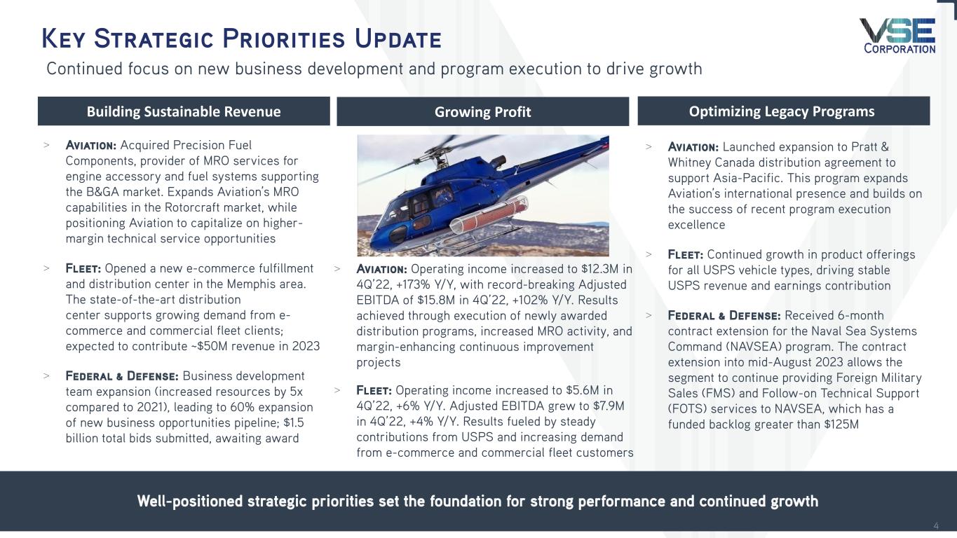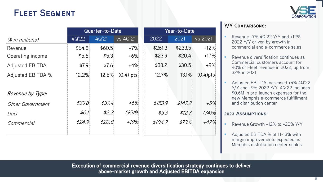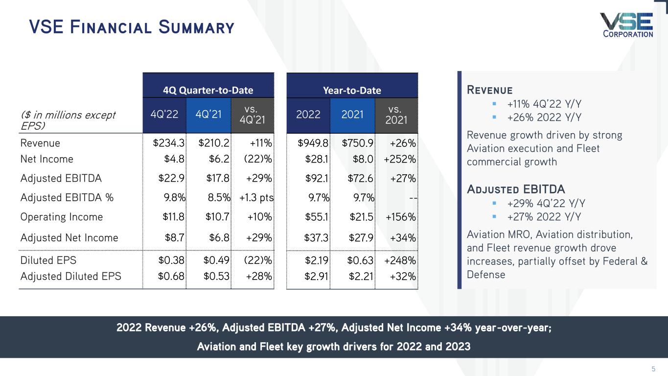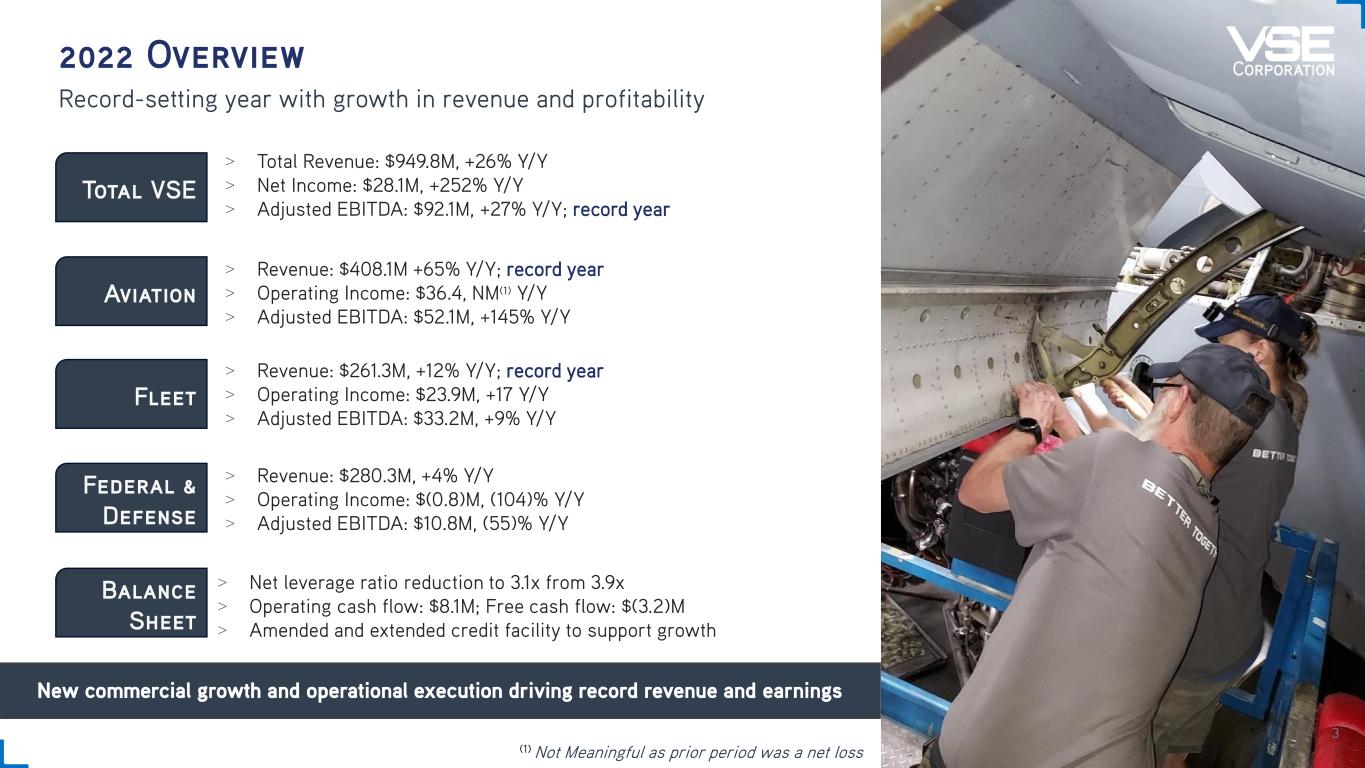 2022 Overview Record-setting year with growth in revenue and profitability Total VSE > Total Revenue: $949.8M, +26% Y/Y > Net Income: $28.1M, +252% Y/Y > Adjusted EBITDA: $92.1M, +27% Y/Y; record year Aviation > Revenue: $408.1M +65% Y/Y; record year > Operating Income: $36.4, NM(1) Y/Y > Adjusted EBITDA: $52.1M, +145% Y/Y Federal & Defense > Revenue: $280.3M, +4% Y/Y > Operating Income: $(0.8)M, (104)% Y/Y > Adjusted EBITDA: $10.8M, (55)% Y/Y Fleet > Revenue: $261.3M, +12% Y/Y; record year > Operating Income: $23.9M, +17 Y/Y > Adjusted EBITDA: $33.2M, +9% Y/Y Balance Sheet > Net leverage ratio reduction to 3.1x from 3.9x > Operating cash flow: $8.1M; Free cash flow: $(3.2)M > Amended and extended credit facility to support growth New commercial growth and operational execution driving record revenue and earnings (1) Not Meaningful as prior period was a net loss 3