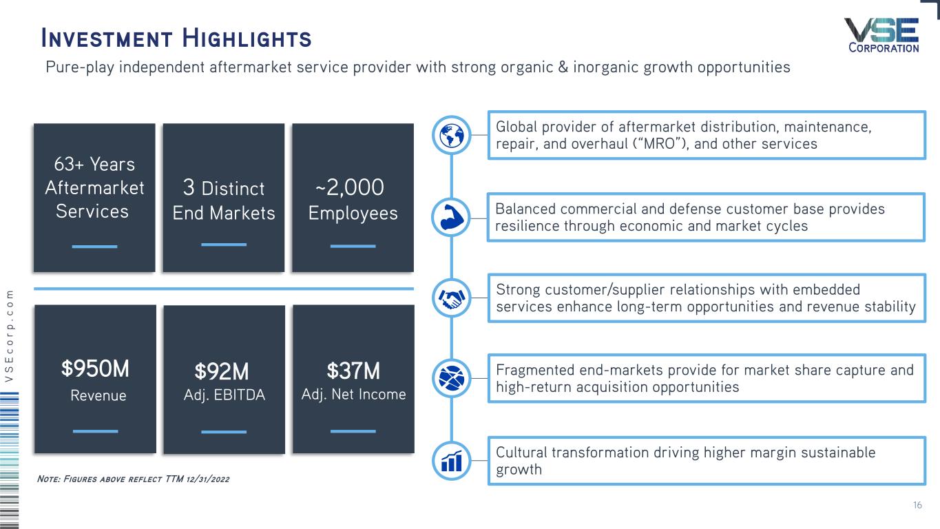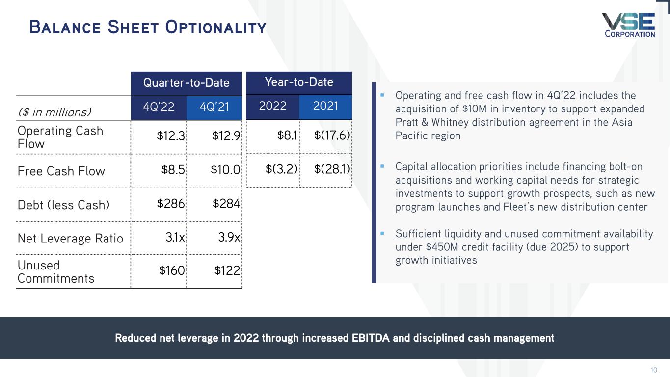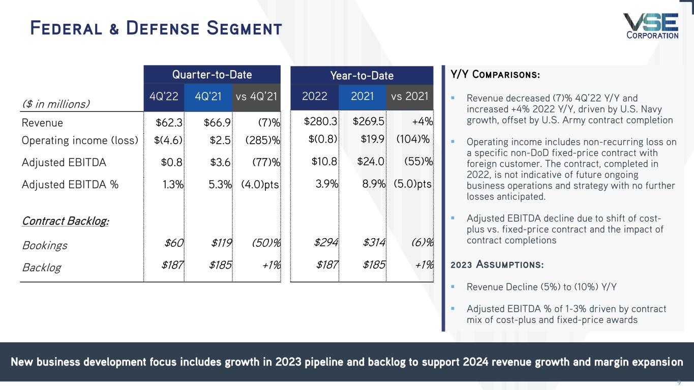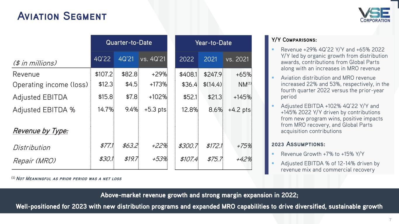 2022 Overview Record-setting year with growth in revenue and profitability Total VSE > Total Revenue: $949.8M, +26% Y/Y > Net Income: $28.1M, +252% Y/Y > Adjusted EBITDA: $92.1M, +27% Y/Y; record year Aviation > Revenue: $408.1M +65% Y/Y; record year > Operating Income: $36.4, NM(1) Y/Y > Adjusted EBITDA: $52.1M, +145% Y/Y Federal & Defense > Revenue: $280.3M, +4% Y/Y > Operating Income: $(0.8)M, (104)% Y/Y > Adjusted EBITDA: $10.8M, (55)% Y/Y Fleet > Revenue: $261.3M, +12% Y/Y; record year > Operating Income: $23.9M, +17 Y/Y > Adjusted EBITDA: $33.2M, +9% Y/Y Balance Sheet > Net leverage ratio reduction to 3.1x from 3.9x > Operating cash flow: $8.1M; Free cash flow: $(3.2)M > Amended and extended credit facility to support growth New commercial growth and operational execution driving record revenue and earnings (1) Not Meaningful as prior period was a net loss 3