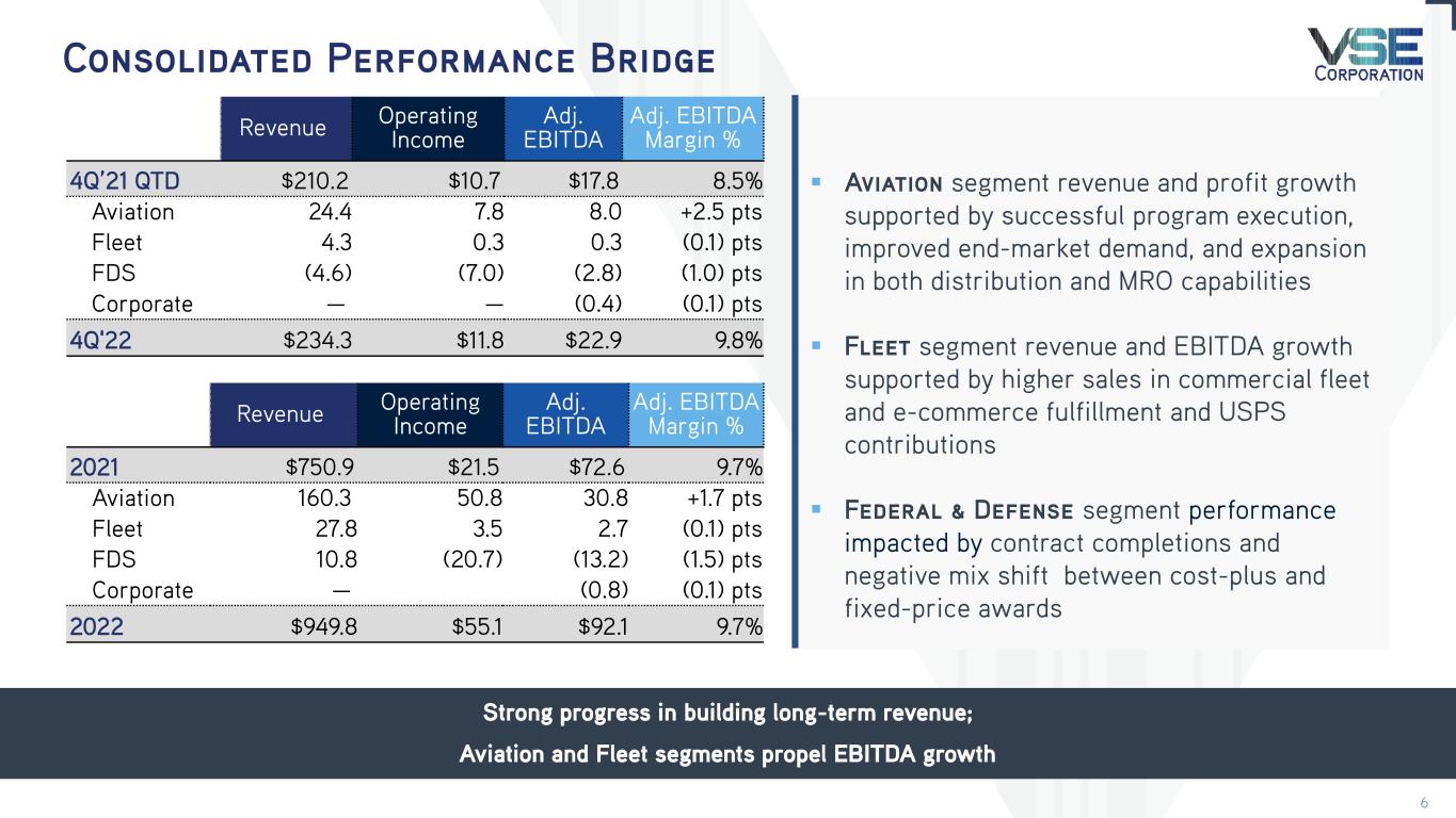 VSE Financial Summary 2022 Revenue +26%, Adjusted EBITDA +27%, Adjusted Net Income +34% year-over-year; Aviation and Fleet key growth drivers for 2022 and 2023 ($ in millions except EPS) 4Q Quarter-to-Date 4Q'22 4Q’21 vs. 4Q'21 Revenue $234.3 $210.2 +11% Net Income $4.8 $6.2 (22)% Adjusted EBITDA $22.9 $17.8 +29% Adjusted EBITDA % 9.8% 8.5% +1.3 pts Operating Income $11.8 $10.7 +10% Adjusted Net Income $8.7 $6.8 +29% Diluted EPS $0.38 $0.49 (22)% Adjusted Diluted EPS $0.68 $0.53 +28% Revenue ▪ +11% 4Q’22 Y/Y ▪ +26% 2022 Y/Y Revenue growth driven by strong Aviation execution and Fleet commercial growth Adjusted EBITDA ▪ +29% 4Q’22 Y/Y ▪ +27% 2022 Y/Y Aviation MRO, Aviation distribution, and Fleet revenue growth drove increases, partially offset by Federal & Defense 5 Year-to-Date 2022 2021 vs. 2021 $949.8 $750.9 +26% $28.1 $8.0 +252% $92.1 $72.6 +27% 9.7% 9.7% -- $55.1 $21.5 +156% $37.3 $27.9 +34% $2.19 $0.63 +248% $2.91 $2.21 +32%