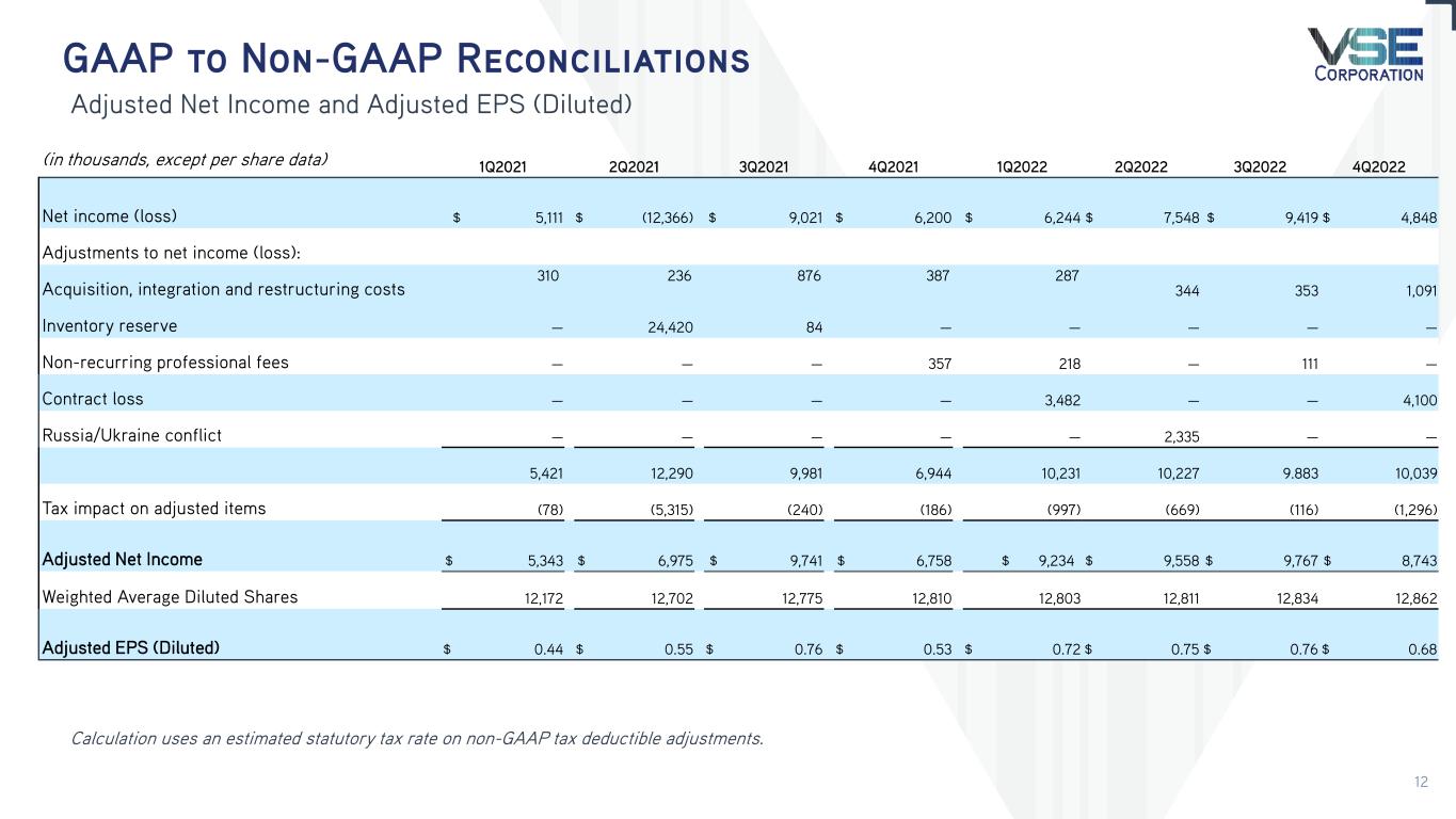 GAAP to Non-GAAP Reconciliations Adjusted Net Income and Adjusted EPS (Diluted) Calculation uses an estimated statutory tax rate on non-GAAP tax deductible adjustments. (in thousands, except per share data) 1Q2021 2Q2021 3Q2021 4Q2021 1Q2022 2Q2022 3Q2022 4Q2022 Net income (loss) $ 5,111 $ (12,366) $ 9,021 $ 6,200 $ 6,244 $ 7,548 $ 9,419 $ 4,848 Adjustments to net income (loss): Acquisition, integration and restructuring costs 310 236 876 387 287 344 353 1,091 Inventory reserve — 24,420 84 — — — — — Non-recurring professional fees — — — 357 218 — 111 — Contract loss — — — — 3,482 — — 4,100 Russia/Ukraine conflict — — — — — 2,335 — — 5,421 12,290 9,981 6,944 10,231 10,227 9.883 10,039 Tax impact on adjusted items (78) (5,315) (240) (186) (997) (669) (116) (1,296) Adjusted Net Income $ 5,343 $ 6,975 $ 9,741 $ 6,758 $ 9,234 $ 9,558 $ 9,767 $ 8,743 Weighted Average Diluted Shares 12,172 12,702 12,775 12,810 12,803 12,811 12,834 12,862 Adjusted EPS (Diluted) $ 0.44 $ 0.55 $ 0.76 $ 0.53 $ 0.72 $ 0.75 $ 0.76 $ 0.68 12