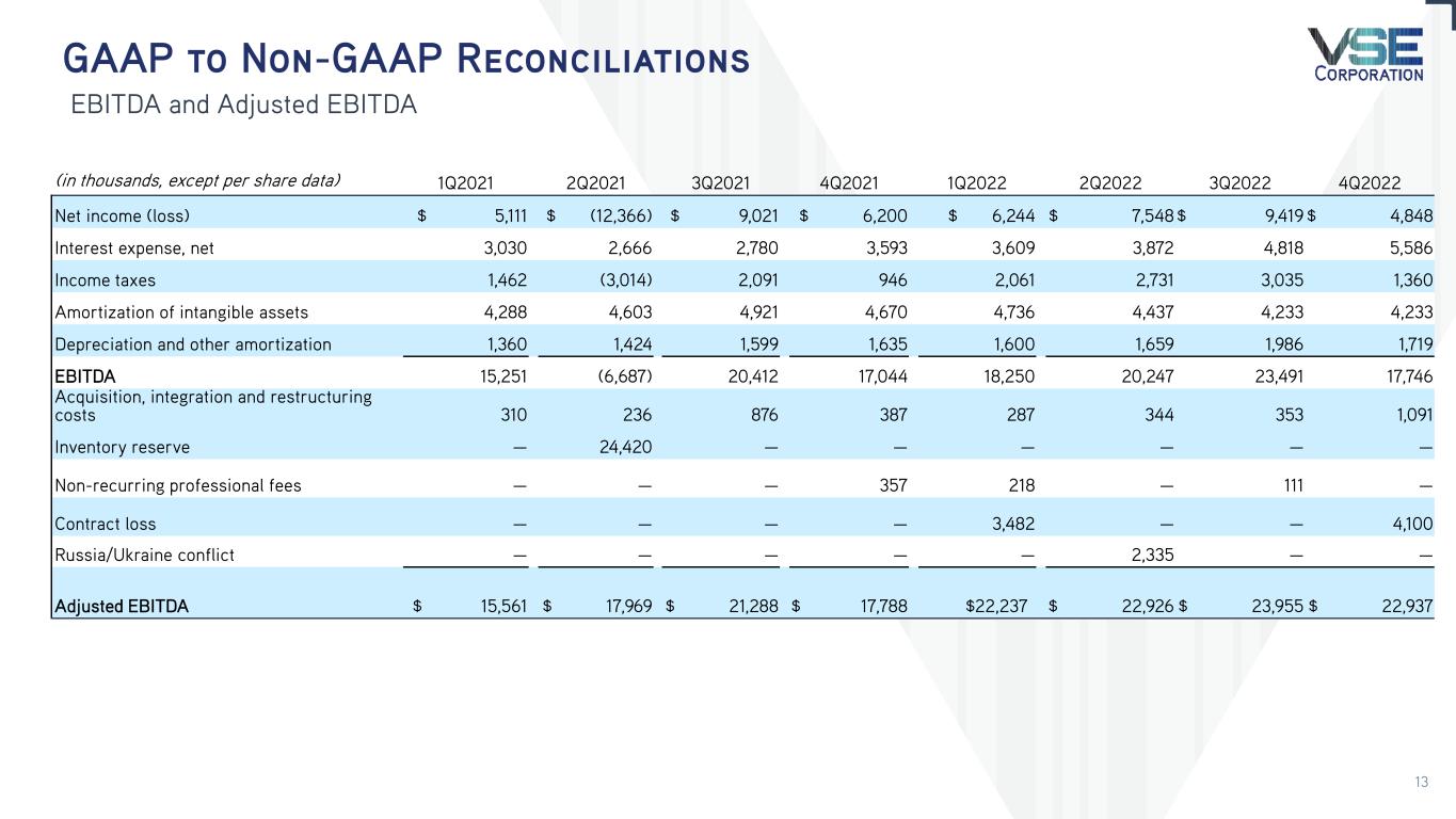 GAAP to Non-GAAP Reconciliations EBITDA and Adjusted EBITDA (in thousands, except per share data) 1Q2021 2Q2021 3Q2021 4Q2021 1Q2022 2Q2022 3Q2022 4Q2022 Net income (loss) $ 5,111 $ (12,366) $ 9,021 $ 6,200 $ 6,244 $ 7,548 $ 9,419 $ 4,848 Interest expense, net 3,030 2,666 2,780 3,593 3,609 3,872 4,818 5,586 Income taxes 1,462 (3,014) 2,091 946 2,061 2,731 3,035 1,360 Amortization of intangible assets 4,288 4,603 4,921 4,670 4,736 4,437 4,233 4,233 Depreciation and other amortization 1,360 1,424 1,599 1,635 1,600 1,659 1,986 1,719 EBITDA 15,251 (6,687) 20,412 17,044 18,250 20,247 23,491 17,746 Acquisition, integration and restructuring costs 310 236 876 387 287 344 353 1,091 Inventory reserve — 24,420 — — — — — — Non-recurring professional fees — — — 357 218 — 111 — Contract loss — — — — 3,482 — — 4,100 Russia/Ukraine conflict — — — — — 2,335 — — Adjusted EBITDA $ 15,561 $ 17,969 $ 21,288 $ 17,788 $22,237 $ 22,926 $ 23,955 $ 22,937 13