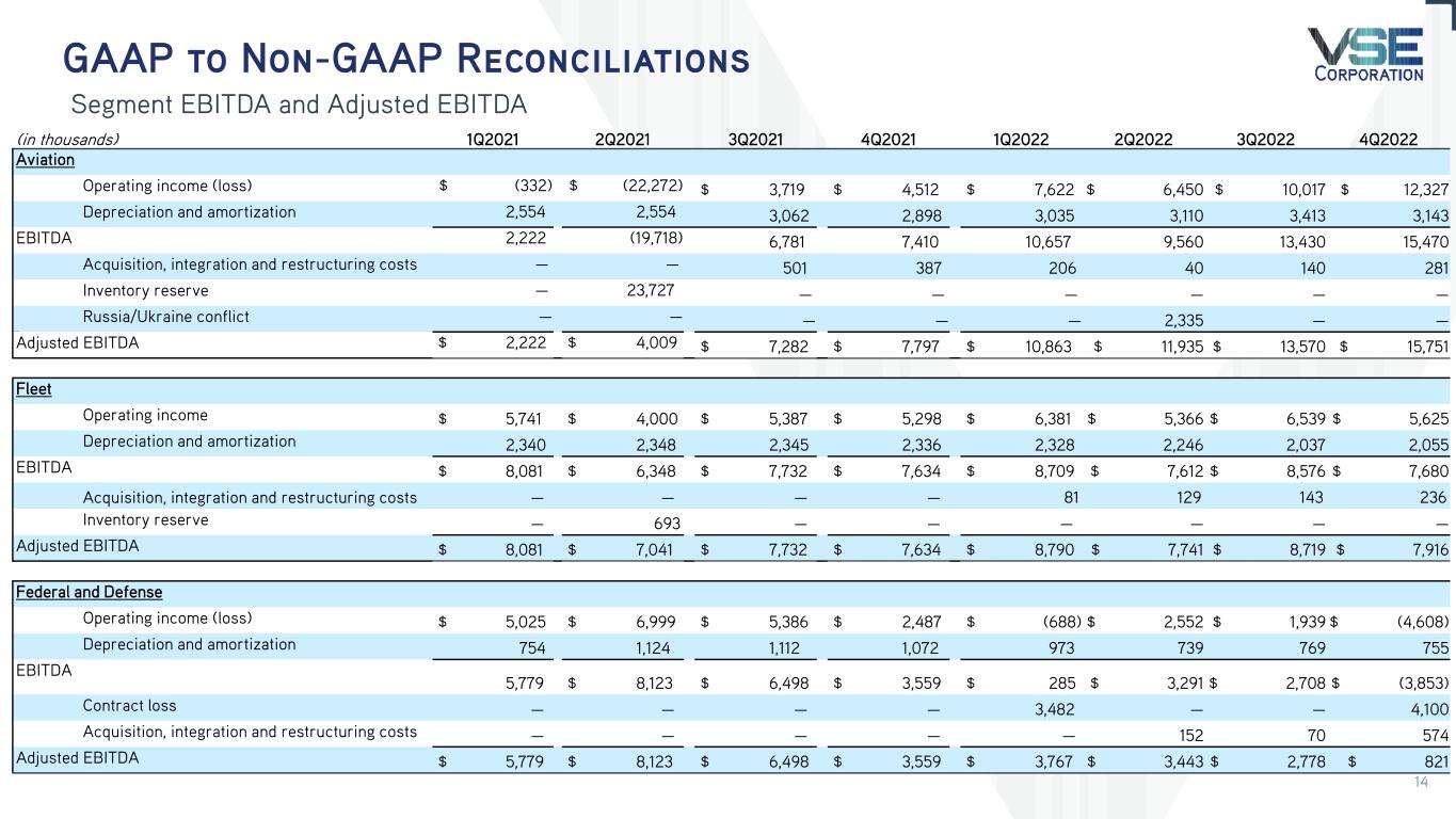 GAAP to Non-GAAP Reconciliations Segment EBITDA and Adjusted EBITDA (in thousands) 1Q2021 2Q2021 3Q2021 4Q2021 1Q2022 2Q2022 3Q2022 4Q2022 Aviation Operating income (loss) $ (332) $ (22,272) $ 3,719 $ 4,512 $ 7,622 $ 6,450 $ 10,017 $ 12,327 Depreciation and amortization 2,554 2,554 3,062 2,898 3,035 3,110 3,413 3,143 EBITDA 2,222 (19,718) 6,781 7,410 10,657 9,560 13,430 15,470 Acquisition, integration and restructuring costs — — 501 387 206 40 140 281 Inventory reserve — 23,727 — — — — — — Russsdfsd Russia/Ukraine conflict — — — — — 2,335 — — Adjusted EBITDA $ 2,222 $ 4,009 $ 7,282 $ 7,797 $ 10,863 $ 11,935 $ 13,570 $ 15,751 Fleet Operating income $ 5,741 $ 4,000 $ 5,387 $ 5,298 $ 6,381 $ 5,366 $ 6,539 $ 5,625 Depreciation and amortization 2,340 2,348 2,345 2,336 2,328 2,246 2,037 2,055 EBITDA $ 8,081 $ 6,348 $ 7,732 $ 7,634 $ 8,709 $ 7,612 $ 8,576 $ 7,680 Acquisition, integration and restructuring costs — — — — 81 129 143 236 Inventory reserve — 693 — — — — — — Adjusted EBITDA $ 8,081 $ 7,041 $ 7,732 $ 7,634 $ 8,790 $ 7,741 $ 8,719 $ 7,916 Federal and Defense Operating income (loss) $ 5,025 $ 6,999 $ 5,386 $ 2,487 $ (688) $ 2,552 $ 1,939 $ (4,608) Depreciation and amortization 754 1,124 1,112 1,072 973 739 769 755 EBITDA 5,779 $ 8,123 $ 6,498 $ 3,559 $ 285 $ 3,291 $ 2,708 $ (3,853) Contract loss — — — — 3,482 — — 4,100 Acquisition, integration and restructuring costs — — — — — 152 70 574 Adjusted EBITDA $ 5,779 $ 8,123 $ 6,498 $ 3,559 $ 3,767 $ 3,443 $ 2,778 $ 821 14