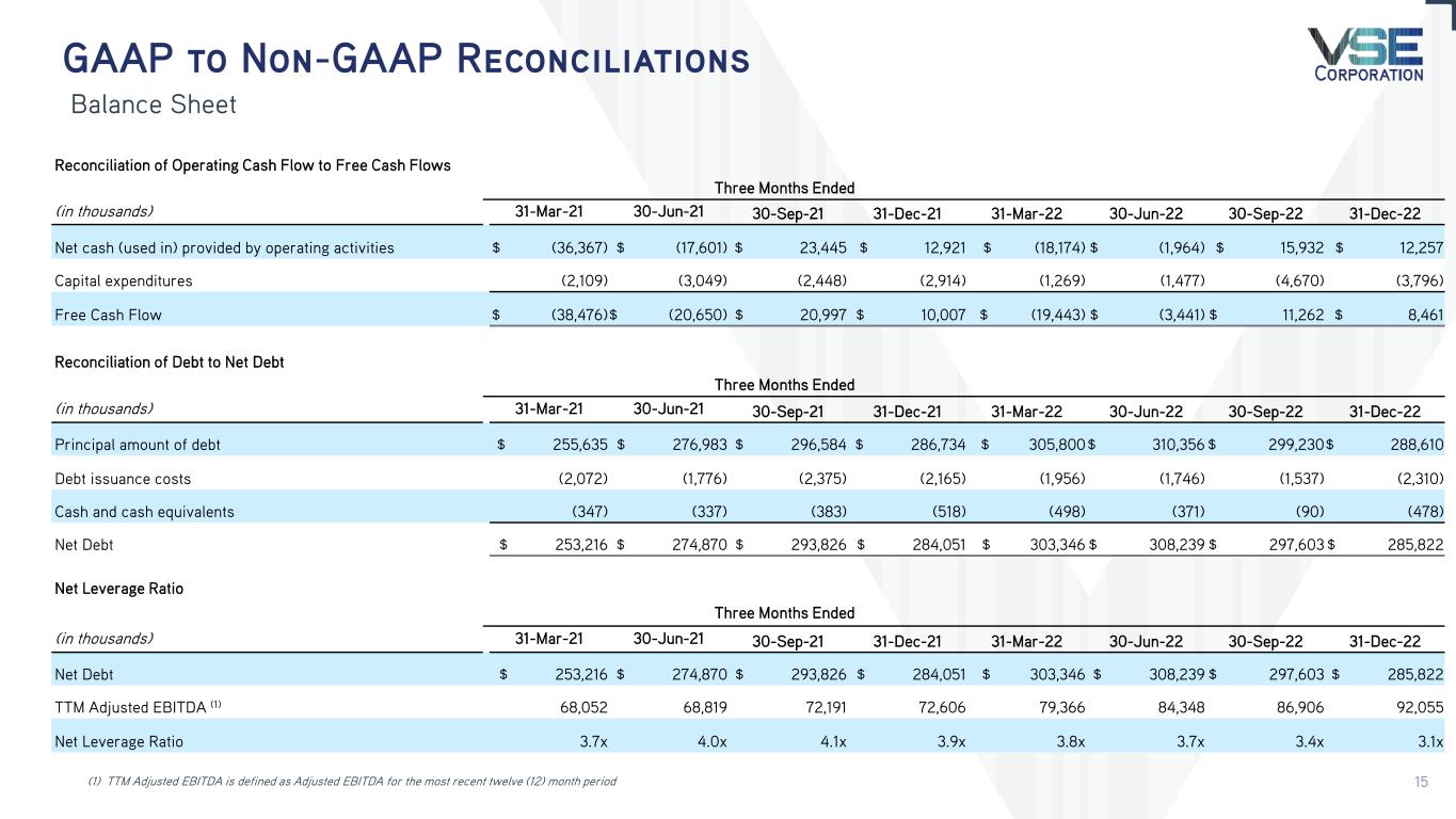 GAAP to Non-GAAP Reconciliations Balance Sheet (1) TTM Adjusted EBITDA is defined as Adjusted EBITDA for the most recent twelve (12) month period Reconciliation of Operating Cash Flow to Free Cash Flows Three Months Ended (in thousands) 31-Mar-21 30-Jun-21 30-Sep-21 31-Dec-21 31-Mar-22 30-Jun-22 30-Sep-22 31-Dec-22 Net cash (used in) provided by operating activities $ (36,367) $ (17,601) $ 23,445 $ 12,921 $ (18,174) $ (1,964) $ 15,932 $ 12,257 Capital expenditures (2,109) (3,049) (2,448) (2,914) (1,269) (1,477) (4,670) (3,796) Free Cash Flow $ (38,476)$ (20,650) $ 20,997 $ 10,007 $ (19,443) $ (3,441) $ 11,262 $ 8,461 Reconciliation of Debt to Net Debt Three Months Ended (in thousands) 31-Mar-21 30-Jun-21 30-Sep-21 31-Dec-21 31-Mar-22 30-Jun-22 30-Sep-22 31-Dec-22 Principal amount of debt $ 255,635 $ 276,983 $ 296,584 $ 286,734 $ 305,800$ 310,356 $ 299,230$ 288,610 Debt issuance costs (2,072) (1,776) (2,375) (2,165) (1,956) (1,746) (1,537) (2,310) Cash and cash equivalents (347) (337) (383) (518) (498) (371) (90) (478) Net Debt $ 253,216 $ 274,870 $ 293,826 $ 284,051 $ 303,346 $ 308,239 $ 297,603 $ 285,822 Net Leverage Ratio Three Months Ended (in thousands) 31-Mar-21 30-Jun-21 30-Sep-21 31-Dec-21 31-Mar-22 30-Jun-22 30-Sep-22 31-Dec-22 Net Debt $ 253,216 $ 274,870 $ 293,826 $ 284,051 $ 303,346 $ 308,239 $ 297,603 $ 285,822 TTM Adjusted EBITDA (1) 68,052 68,819 72,191 72,606 79,366 84,348 86,906 92,055 Net Leverage Ratio 3.7x 4.0x 4.1x 3.9x 3.8x 3.7x 3.4x 3.1x 15