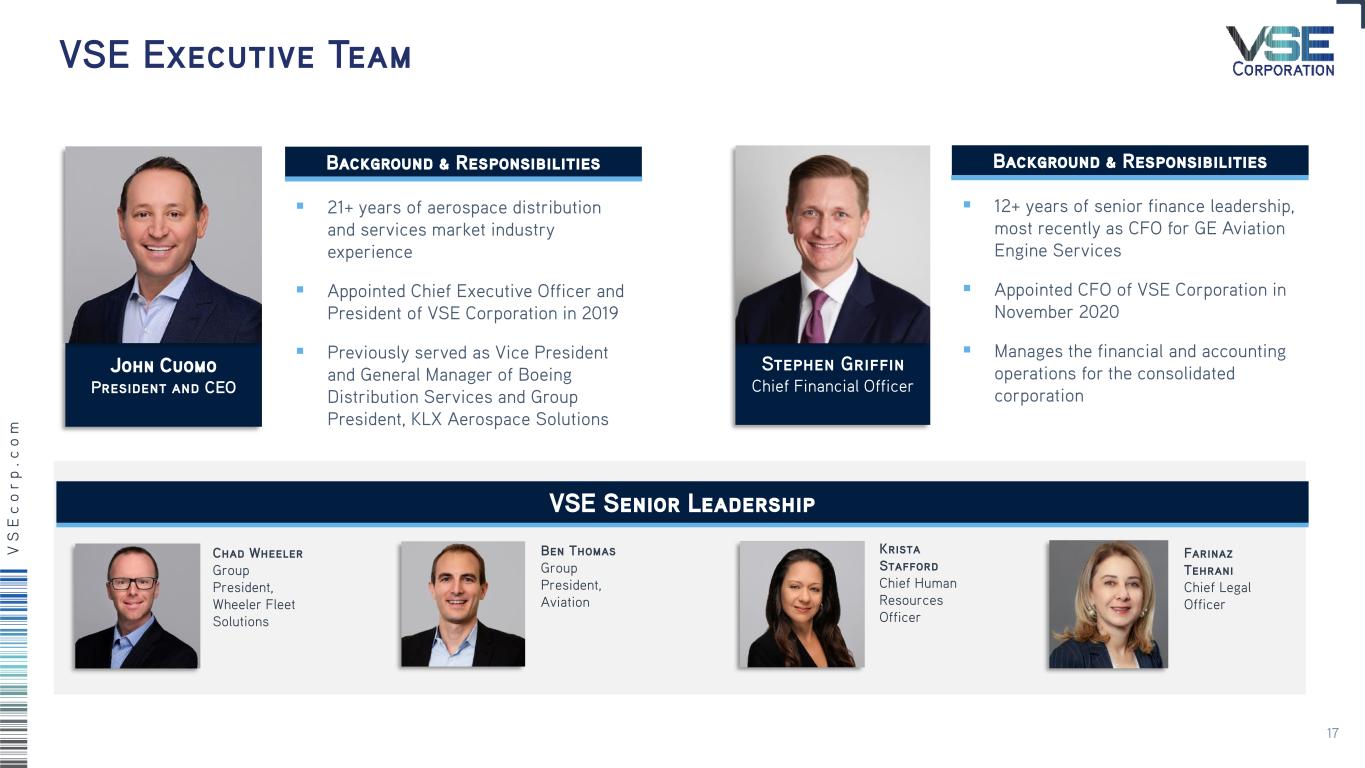V S E c o r p .c o m VSE Executive Team VSE Senior Leadership John Cuomo President and CEO ▪ 21+ years of aerospace distribution and services market industry experience ▪ Appointed Chief Executive Officer and President of VSE Corporation in 2019 ▪ Previously served as Vice President and General Manager of Boeing Distribution Services and Group President, KLX Aerospace Solutions Stephen Griffin Chief Financial Officer ▪ 12+ years of senior finance leadership, most recently as CFO for GE Aviation Engine Services ▪ Appointed CFO of VSE Corporation in November 2020 ▪ Manages the financial and accounting operations for the consolidated corporation Chad Wheeler Group President, Wheeler Fleet Solutions Ben Thomas Group President, Aviation Krista Stafford Chief Human Resources Officer Background & ResponsibilitiesBackground & Responsibilities Farinaz Tehrani Chief Legal Officer 17