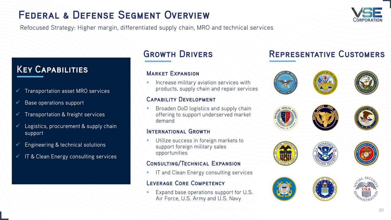 Federal & Defense Segment Overview Refocused Strategy: Higher margin, differentiated supply chain, MRO and technical services Market Expansion ▪ Increase military aviation services with products, supply chain and repair services Capability Development ▪ Broaden DoD logistics and supply chain offering to support underserved market demand International Growth ▪ Utilize success in foreign markets to support foreign military sales opportunities Consulting/Technical Expansion ▪ IT and Clean Energy consulting services Leverage Core Competency ▪ Expand base operations support for U.S. Air Force, U.S. Army and U.S. Navy Growth Drivers ✓ Transportation asset MRO services ✓ Base operations support ✓ Transportation & freight services ✓ Logistics, procurement & supply chain support ✓ Engineering & technical solutions ✓ IT & Clean Energy consulting services Key Capabilities Representative Customers 20