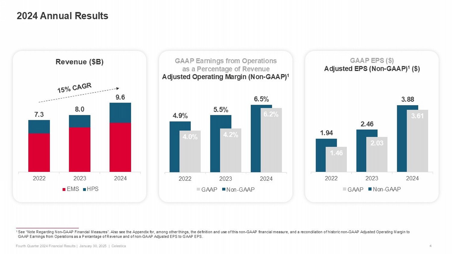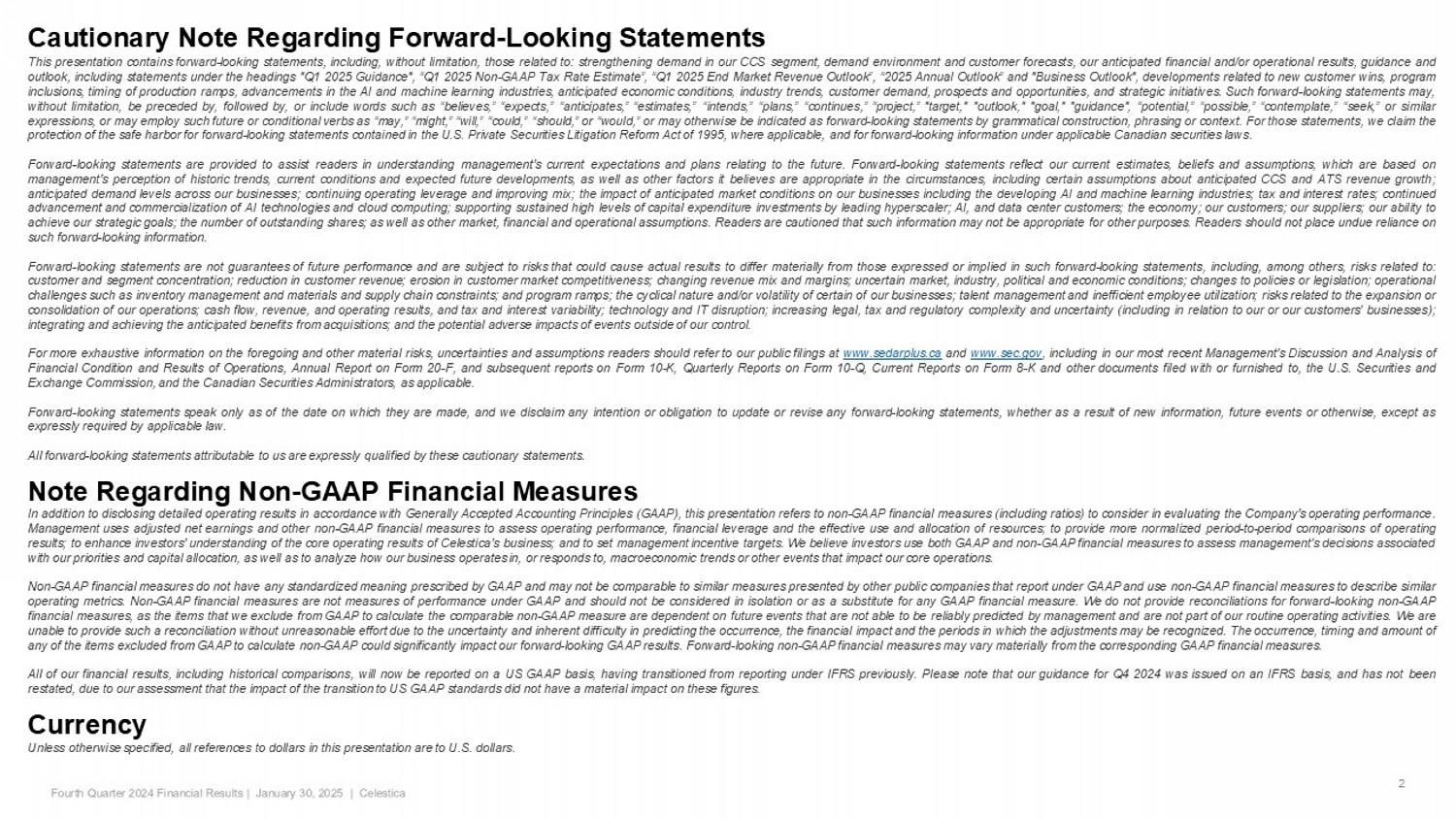 Cautionary Note Regarding Forward - Looking Statements 2 This presentation contains forward - looking statements, including, without limitation, those related to : strengthening demand in our CCS segment, demand environment and customer forecasts, our anticipated financial and/or operational results, guidance and outlook, including statements under the headings "Q 1 2025 Guidance", “Q 1 2025 Non - GAAP Tax Rate Estimate”, “Q 1 2025 End Market Revenue Outlook”, “ 2025 Annual Outlook” and "Business Outlook", developments related to new customer wins, program inclusions, timing of production ramps, advancements in the AI and machine learning industries, anticipated economic conditions, industry trends, customer demand, prospects and opportunities, and strategic initiatives . Such forward - looking statements may, without limitation, be preceded by, followed by, or include words such as “believes,” “expects,” “anticipates,” “estimates,” “intends,” “plans,” “continues,” “project,” "target," "outlook," "goal," "guidance", “potential,” “possible,” “contemplate,” “seek,” or similar expressions, or may employ such future or conditional verbs as “may,” “might,” “will,” “could,” “should,” or “would,” or may otherwise be indicated as forward - looking statements by grammatical construction, phrasing or context . For those statements, we claim the protection of the safe harbor for forward - looking statements contained in the U . S . Private Securities Litigation Reform Act of 1995 , where applicable, and for forward - looking information under applicable Canadian securities laws . Forward - looking statements are provided to assist readers in understanding management’s current expectations and plans relating to the future . Forward - looking statements reflect our current estimates, beliefs and assumptions, which are based on management’s perception of historic trends, current conditions and expected future developments, as well as other factors it believes are appropriate in the circumstances, including certain assumptions about anticipated CCS and ATS revenue growth ; anticipated demand levels across our businesses ; continuing operating leverage and improving mix ; the impact of anticipated market conditions on our businesses including the developing AI and machine learning industries ; tax and interest rates ; continued advancement and commercialization of AI technologies and cloud computing ; supporting sustained high levels of capital expenditure investments by leading hyperscaler ; AI, and data center customers ; the economy ; our customers ; our suppliers ; our ability to achieve our strategic goals ; the number of outstanding shares ; as well as other market, financial and operational assumptions . Readers are cautioned that such information may not be appropriate for other purposes . Readers should not place undue reliance on such forward - looking information . Forward - looking statements are not guarantees of future performance and are subject to risks that could cause actual results to differ materially from those expressed or implied in such forward - looking statements, including, among others, risks related to : customer and segment concentration ; reduction in customer revenue ; erosion in customer market competitiveness ; changing revenue mix and margins ; uncertain market, industry, political and economic conditions ; changes to policies or legislation ; operational challenges such as inventory management and materials and supply chain constraints ; and program ramps ; the cyclical nature and/or volatility of certain of our businesses ; talent management and inefficient employee utilization ; risks related to the expansion or consolidation of our operations ; cash flow, revenue, and operating results, and tax and interest variability ; technology and IT disruption ; increasing legal, tax and regulatory complexity and uncertainty (including in relation to our or our customers' businesses) ; integrating and achieving the anticipated benefits from acquisitions ; and the potential adverse impacts of events outside of our control . For more exhaustive information on the foregoing and other material risks, uncertainties and assumptions readers should refer to our public filings at www . sedarplus . ca and www . sec . gov , including in our most recent Management's Discussion and Analysis of Financial Condition and Results of Operations, Annual Report on Form 20 - F, and subsequent reports on Form 10 - K, Quarterly Reports on Form 10 - Q, Current Reports on Form 8 - K and other documents filed with or furnished to, the U . S . Securities and Exchange Commission, and the Canadian Securities Administrators, as applicable . Forward - looking statements speak only as of the date on which they are made, and we disclaim any intention or obligation to update or revise any forward - looking statements, whether as a result of new information, future events or otherwise, except as expressly required by applicable law . All forward - looking statements attributable to us are expressly qualified by these cautionary statements . Note Regarding Non - GAAP Financial Measures In addition to disclosing detailed operating results in accordance with Generally Accepted Accounting Principles (GAAP), this presentation refers to non - GAAP financial measures (including ratios) to consider in evaluating the Company’s operating performance . Management uses adjusted net earnings and other non - GAAP financial measures to assess operating performance, financial leverage and the effective use and allocation of resources ; to provide more normalized period - to - period comparisons of operating results ; to enhance investors’ understanding of the core operating results of Celestica’s business ; and to set management incentive targets . We believe investors use both GAAP and non - GAAP financial measures to assess manageme