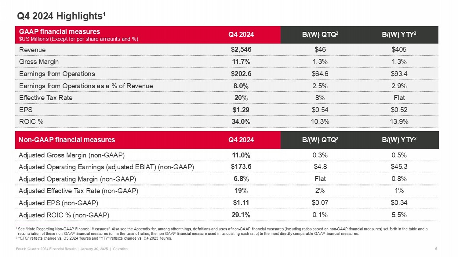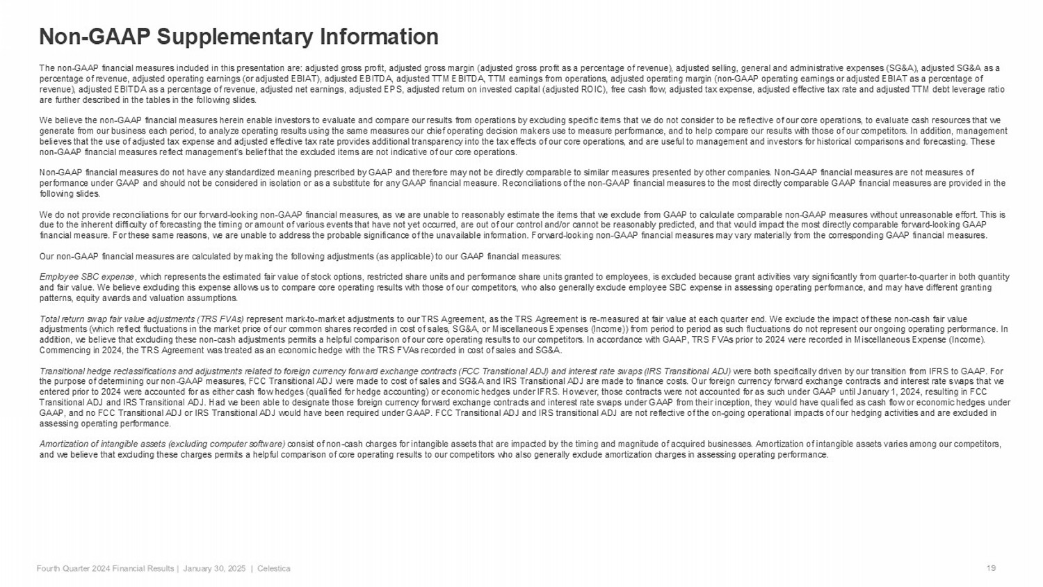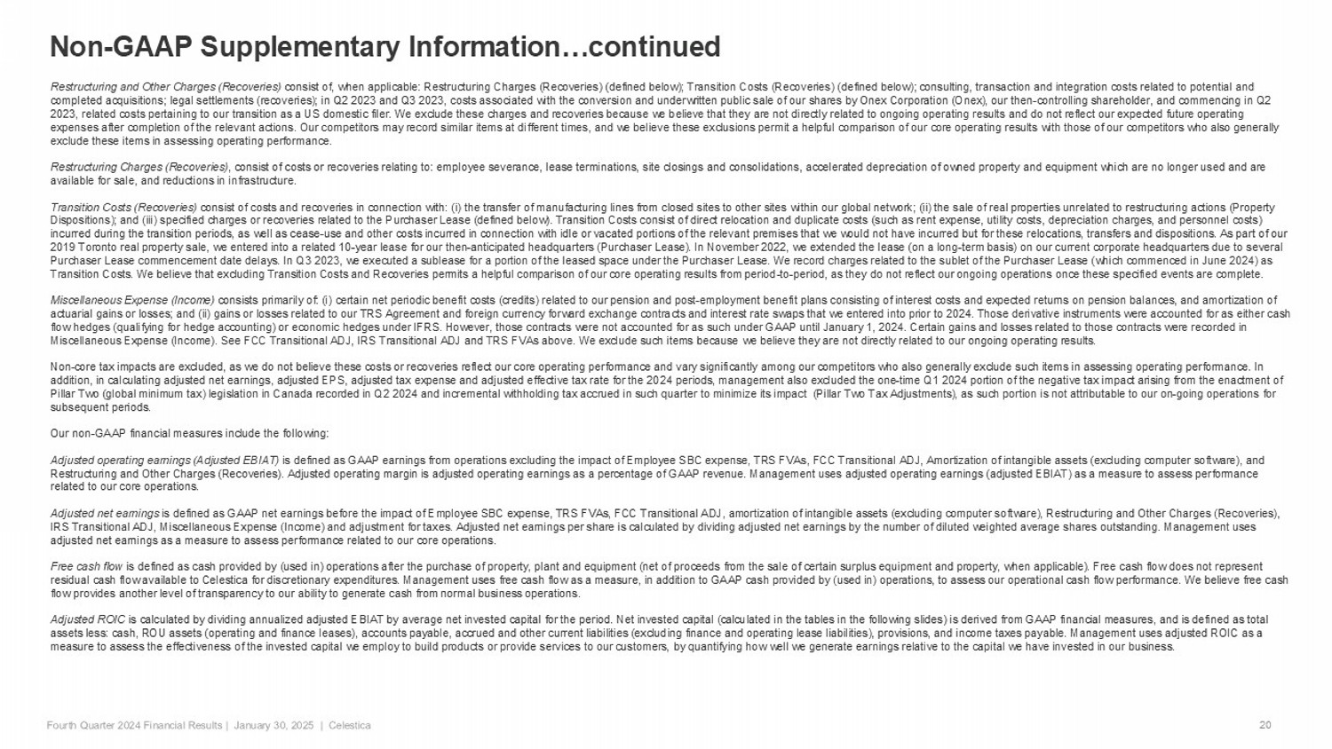 Non - GAAP Supplementary Information…continued 20 Restructuring and Other Charges (Recoveries) consist of, when applicable: Restructuring Charges (Recoveries) (defined below); Transition Costs (Recoveries) (defined below ); consulting, transaction and integration costs related to potential and completed acquisitions; legal settlements (recoveries); in Q2 2023 and Q3 2023, costs associated with the conversion and unde rwr itten public sale of our shares by Onex Corporation (Onex), our then - controlling shareholder, and commencing in Q2 2023, related costs pertaining to our transition as a US domestic filer. We exclude these charges and recoveries because we b eli eve that they are not directly related to ongoing operating results and do not reflect our expected future operating expenses after completion of the relevant actions. Our competitors may record similar items at different times, and we believ e t hese exclusions permit a helpful comparison of our core operating results with those of our competitors who also generally exclude these items in assessing operating performance. Restructuring Charges (Recoveries) , consist of costs or recoveries relating to: employee severance, lease terminations, site closings and consolidations, accel era ted depreciation of owned property and equipment which are no longer used and are available for sale, and reductions in infrastructure. Transition Costs (Recoveries) consist of costs and recoveries in connection with: ( i ) the transfer of manufacturing lines from closed sites to other sites within our global network; (ii) the sale of real prope rti es unrelated to restructuring actions (Property Dispositions); and (iii) specified charges or recoveries related to the Purchaser Lease (defined below). Transition Costs con sis t of direct relocation and duplicate costs (such as rent expense, utility costs, depreciation charges, and personnel costs) incurred during the transition periods, as well as cease - use and other costs incurred in connection with idle or vacated portion s of the relevant premises that we would not have incurred but for these relocations, transfers and dispositions. As part of our 2019 Toronto real property sale, we entered into a related 10 - year lease for our then - anticipated headquarters (Purchaser Lease) . In November 2022, we extended the lease (on a long - term basis) on our current corporate headquarters due to several Purchaser Lease commencement date delays. In Q3 2023, we executed a sublease for a portion of the leased space under the Purc has er Lease. We record charges related to the sublet of the Purchaser Lease (which commenced in June 2024) as Transition Costs. We believe that excluding Transition Costs and Recoveries permits a helpful comparison of our core operatin g r esults from period - to - period, as they do not reflect our ongoing operations once these specified events are complete. Miscellaneous Expense (Income) consists primarily of: ( i ) certain net periodic benefit costs (credits) related to our pension and post - employment benefit plans consisting of interest c osts and expected returns on pension balances, and amortization of actuarial gains or losses; and (ii) gains or losses related to our TRS Agreement and foreign currency forward exchange contra cts and interest rate swaps that we entered into prior to 2024. Those derivative instruments were accounted for as either cash flow hedges (qualifying for hedge accounting) or economic hedges under IFRS. However, those contracts were not accounted for as such under GAAP until January 1, 2024. Certain gains and losses related to those contracts were recorded in Miscellaneous Expense (Income). See FCC Transitional ADJ, IRS Transitional ADJ and TRS FVAs above. We exclude such items beca use we believe they are not directly related to our ongoing operating results. Non - core tax impacts are excluded, as we do not believe these costs or recoveries reflect our core operating performance and var y significantly among our competitors who also generally exclude such items in assessing operating performance. In addition, in calculating adjusted net earnings, adjusted EPS, adjusted tax expense and adjusted effective tax rate for the 20 24 periods, management also excluded the one - time Q1 2024 portion of the negative tax impact arising from the enactment of Pillar Two (global minimum tax) legislation in Canada recorded in Q2 2024 and incremental withholding tax accrued in such qua rte r to minimize its impact (Pillar Two Tax Adjustments), as such portion is not attributable to our on - going operations for subsequent periods. Our non - GAAP financial measures include the following: Adjusted operating earnings (Adjusted EBIAT) is defined as GAAP earnings from operations excluding the impact of Employee SBC expense, TRS FVAs, FCC Transitional ADJ, Amo rt ization of intangible assets (excluding computer software), and Restructuring and Other Charges (Recoveries). Adjusted operating margin is adjusted operating earnings as a percentage of GAA P r evenue. Management uses adjusted operating earnings (adjusted EBIAT) as a measure to assess performance related to our core operations. Adjusted net earnings is defined as GAAP net earnings before the impact of Employee SBC expense, TRS FVAs, FCC Transitional ADJ, amortization of in ta ngible assets (excluding computer software), Restructuring and Other Charges (Recoveries), IRS Transitional ADJ, Miscellaneous Expense (Income) and adjustment for taxes. Adjusted net earnings per share is calculated by dividing adjusted net earnings by the number of diluted weighted average shares outstanding. Management uses adjusted net earnings as a measure to assess performance related to our core operations. Free cash flow is defined as cash provided by (used in) operations after the purchase of property, plant and equipment (net of proceeds from t he sale of certain surplus equipment and property, when applicable). Free cash flow do