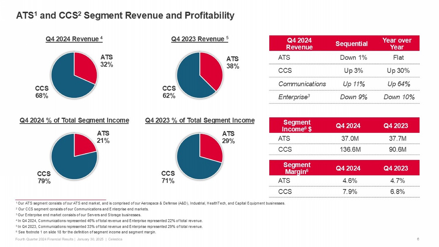 ATS 29% CCS 71% Q4 2023 % of Total Segment Income ATS 32% CCS 68% Q4 2024 Revenue 4 6 1 Our ATS segment consists of our ATS end market, and is comprised of our Aerospace & Defense (A&D), Industrial, HealthTech, an d C apital Equipment businesses. 2 Our CCS segment consists of our Communications and Enterprise end markets. 3 Our Enterprise end market consists of our Servers and Storage businesses. 4 In Q4 2024, Communications represented 46 % of total revenue and Enterprise represented 22% of total revenue. 5 In Q4 2023, Communications represented 33% of total revenue and Enterprise represented 29% of total revenue. 6 See footnote 1 on slide 18 for the definition of segment income and segment margin. Year over Year Sequential Q4 2024 Revenue Flat Down 1% ATS Up 30% Up 3% CCS Up 64% Up 11% Communications Down 10% Down 9% Enterprise 3 Q4 2023 Q4 2024 Segment Margin 6 4.7 % 4.6% ATS 6.8% 7.9% CCS ATS 38% CCS 62% Q4 2023 Revenue 5 ATS 21% CCS 79% Q4 2024 % of Total Segment Income Q4 2023 Q4 2024 Segment Income 6 $ 37.7M 37.0M ATS 90.6 M 136.6M CCS ATS 1 and CCS 2 Segment Revenue and Profitability
