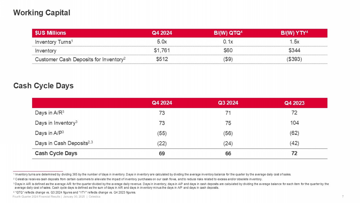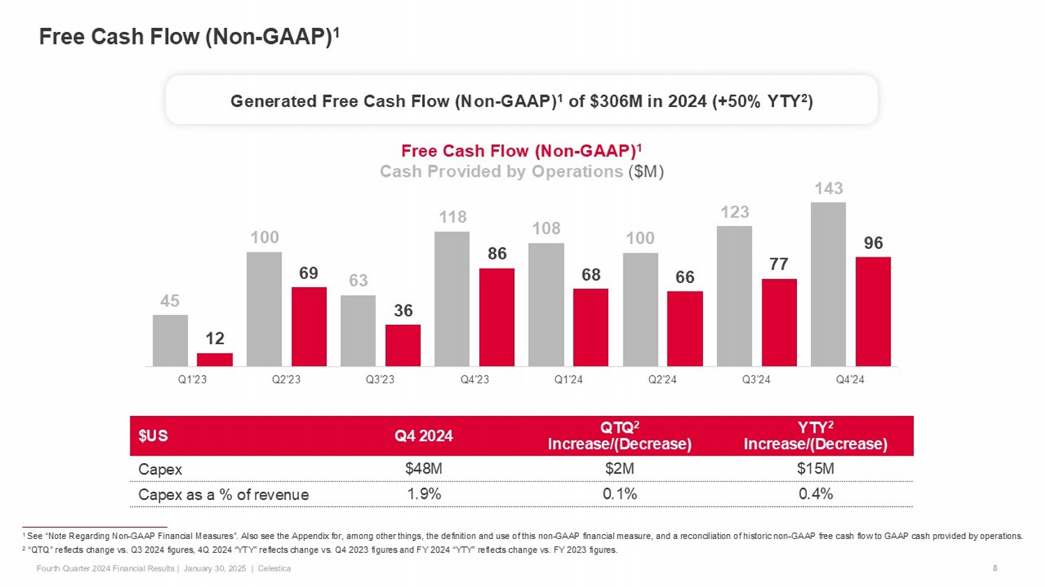 1 Inventory turns are determined by dividing 365 by the number of days in inventory. Days in inventory are calculated by dividi ng the average inventory balance for the quarter by the average daily cost of sales. 2 Celestica receives cash deposits from certain customers to alleviate the impact of inventory purchases on our cash flows, and t o reduce risks related to excess and/or obsolete inventory. 3 Days in A/R is defined as the average A/R for the quarter divided by the average daily revenue. Days in inventory, days in A/ P a nd days in cash deposits are calculated by dividing the average balance for each item for the quarter by the average daily cost of sales. Cash cycle days is defined as the sum of days in A/R and days in inventory minus the days in A/P an d days in cash deposits. 4 “QTQ” reflects change vs. Q3 2024 figures and “YTY” reflects change vs. Q4 2023 figures. Working Capital 7 Cash Cycle Days B/(W) YTY 4 B/(W) QTQ 4 Q4 2024 $US Millions 1.5x 0.1x 5.0x Inventory Turns 1 $344 $60 $1,761 Inventory ($393) ($9) $512 Customer Cash Deposits for Inventory 2 Q4 2023 Q3 2024 Q4 2024 72 71 73 Days in A/R 3 104 75 73 Days in Inventory 3 (62) (56) (55) Days in A/P 3 (42) (24) (22) Days in Cash Deposits 2,3 72 66 69 Cash Cycle Days