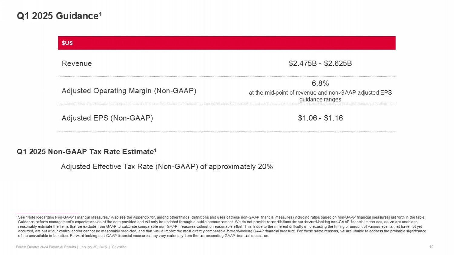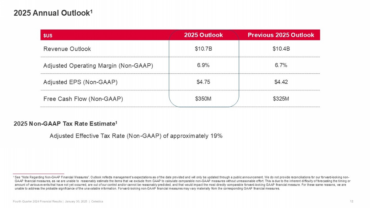 2025 Annual Outlook 1 12 1 See “Note Regarding Non - GAAP Financial Measures”. Outlook reflects management’s expectations as of the date provided and will on ly be updated through a public announcement. We do not provide reconciliations for our forward - looking non - GAAP financial measures, as we are unable to reasonably estimate the items that we exclude from GAAP to calculate comparable no n - GAAP measures without unreasonable effort. This is due to the inherent difficulty of forecasting the timing or amount of various events that have not yet occurred, are out of our control and/or cannot be reasonably predicted, and that w oul d impact the most directly comparable forward - looking GAAP financial measure. For these same reasons, we are unable to address the probable significance of the unavailable information. Forward - looking non - GAAP financial measures may vary materially from the corresponding GAAP financial measures. Previous 2025 Outlook 2025 Outlook $US $10.4B $10.7B Revenue Outlook 6.7% 6.9% Adjusted Operating Margin (Non - GAAP) $4.42 $4.75 Adjusted EPS (Non - GAAP) $325M $350M Free Cash Flow (Non - GAAP) 2025 Non - GAAP Tax Rate Estimate 1 Adjusted Effective Tax Rate (Non - GAAP) of approximately 19%