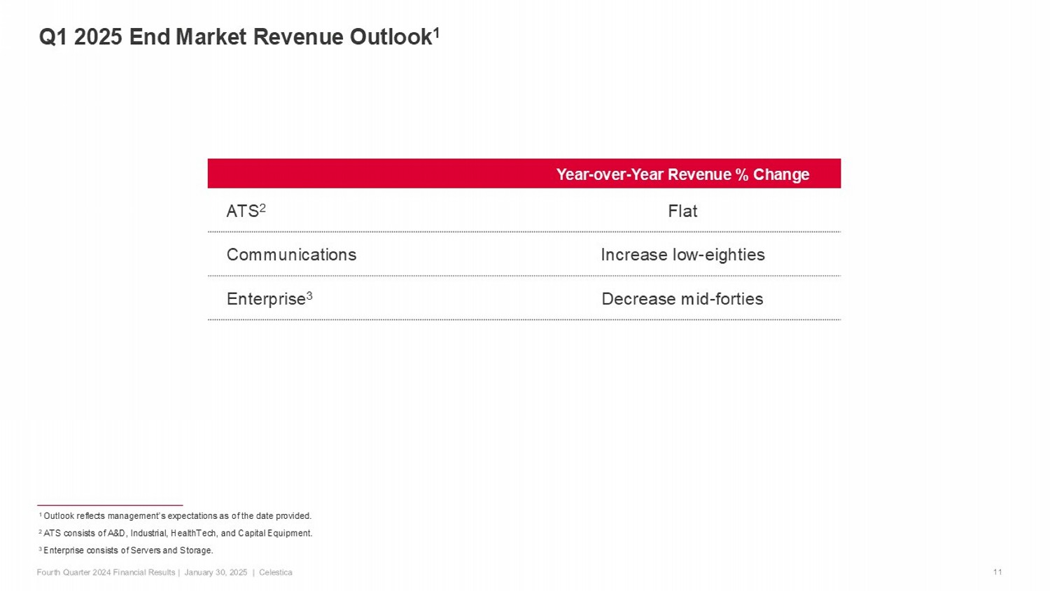 Q1 2025 End Market Revenue Outlook 1 11 Year - over - Year Revenue % Change Flat ATS 2 Increase low - eighties Communications Decrease mid - forties Enterprise 3 1 Outlook reflects management’s expectations as of the date provided. 2 ATS consists of A&D, Industrial, HealthTech, and Capital Equipment. 3 Enterprise consists of Servers and Storage.