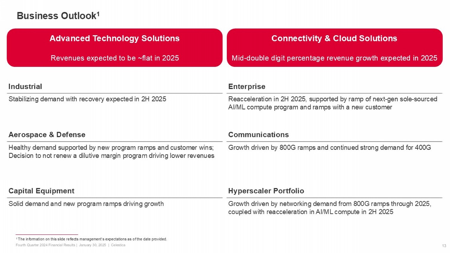 13 Business Outlook 1 Industrial Stabilizing demand with recovery expected in 2H 2025 Aerospace & Defense Healthy demand supported by new program ramps and customer wins; Decision to not renew a dilutive margin program driving lower revenues Capital Equipment Solid demand and new program ramps driving growth 1 The information on this slide reflects management’s expectations as of the date provided. Connectivity & Cloud Solutions Mid - double digit percentage revenue growth expected in 2025 Enterprise Reacceleration in 2H 2025, supported by ramp of next - gen sole - sourced AI/ML compute program and ramps with a new customer Communications Growth driven by 800G ramps and continued strong demand for 400G Hyperscaler Portfolio Growth driven by networking demand from 800G ramps through 2025, coupled with reacceleration in AI/ML compute in 2H 2025 Advanced Technology Solutions Revenues expected to be ~flat in 2025
