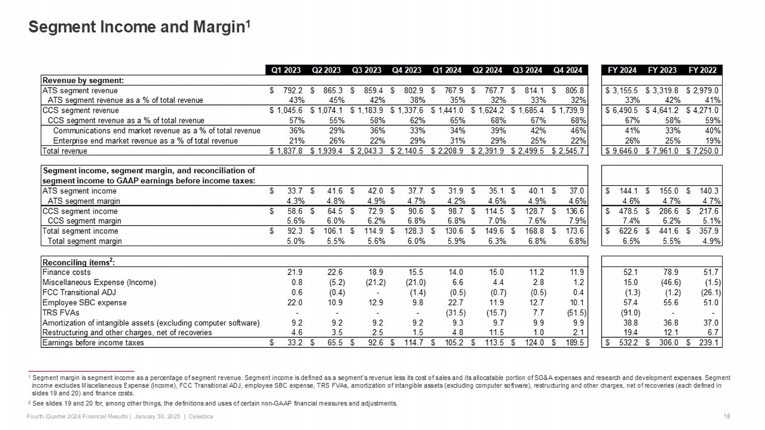 Q1 2023 Q2 2023 Q3 2023 Q4 2023 Q1 2024 Q2 2024 Q3 2024 Q4 2024 FY 2024 FY 2023 FY 2022 Revenue by segment: ATS segment revenue 792.2$ 865.3$ 859.4$ 802.9$ 767.9$ 767.7$ 814.1$ 805.8$ 3,155.5$ 3,319.8$ 2,979.0$ ATS segment revenue as a % of total revenue 43% 45% 42% 38% 35% 32% 33% 32% 33% 42% 41% CCS segment revenue 1,045.6$ 1,074.1$ 1,183.9$ 1,337.6$ 1,441.0$ 1,624.2$ 1,685.4$ 1,739.9$ 6,490.5$ 4,641.2$ 4,271.0$ CCS segment revenue as a % of total revenue 57% 55% 58% 62% 65% 68% 67% 68% 67% 58% 59% Communications end market revenue as a % of total revenue 36% 29% 36% 33% 34% 39% 42% 46% 41% 33% 40% Enterprise end market revenue as a % of total revenue 21% 26% 22% 29% 31% 29% 25% 22% 26% 25% 19% Total revenue 1,837.8$ 1,939.4$ 2,043.3$ 2,140.5$ 2,208.9$ 2,391.9$ 2,499.5$ 2,545.7$ 9,646.0$ 7,961.0$ 7,250.0$ Segment income, segment margin, and reconciliation of segment income to GAAP earnings before income taxes: ATS segment income 33.7$ 41.6$ 42.0$ 37.7$ 31.9$ 35.1$ 40.1$ 37.0$ 144.1$ 155.0$ 140.3$ ATS segment margin 4.3% 4.8% 4.9% 4.7% 4.2% 4.6% 4.9% 4.6% 4.6% 4.7% 4.7% CCS segment income 58.6$ 64.5$ 72.9$ 90.6$ 98.7$ 114.5$ 128.7$ 136.6$ 478.5$ 286.6$ 217.6$ CCS segment margin 5.6% 6.0% 6.2% 6.8% 6.8% 7.0% 7.6% 7.9% 7.4% 6.2% 5.1% Total segment income 92.3$ 106.1$ 114.9$ 128.3$ 130.6$ 149.6$ 168.8$ 173.6$ 622.6$ 441.6$ 357.9$ Total segment margin 5.0% 5.5% 5.6% 6.0% 5.9% 6.3% 6.8% 6.8% 6.5% 5.5% 4.9% Reconciling items 2 : Finance costs 21.9 22.6 18.9 15.5 14.0 15.0 11.2 11.9 52.1 78.9 51.7 Miscellaneous Expense (Income) 0.8 (5.2) (21.2) (21.0) 6.6 4.4 2.8 1.2 15.0 (46.6) (1.5) FCC Transitional ADJ 0.6 (0.4) - (1.4) (0.5) (0.7) (0.5) 0.4 (1.3) (1.2) (26.1) Employee SBC expense 22.0 10.9 12.9 9.8 22.7 11.9 12.7 10.1 57.4 55.6 51.0 TRS FVAs - - - - (31.5) (15.7) 7.7 (51.5) (91.0) - - Amortization of intangible assets (excluding computer software) 9.2 9.2 9.2 9.2 9.3 9.7 9.9 9.9 38.8 36.8 37.0 Restructuring and other charges, net of recoveries 4.6 3.5 2.5 1.5 4.8 11.5 1.0 2.1 19.4 12.1 6.7 Earnings before income taxes 33.2$ 65.5$ 92.6$ 114.7$ 105.2$ 113.5$ 124.0$ 189.5$ 532.2$ 306.0$ 239.1$ Segment Income and Margin 1 18 1 Segment margin is segment income as a percentage of segment revenue. Segment income is defined as a segment’s revenue less it s c ost of sales and its allocatable portion of SG&A expenses and research and development expenses. Segment income excludes Miscellaneous Expense (Income), FCC Transitional ADJ, employee SBC expense, TRS FVAs, amortization of intangi ble assets (excluding computer software), restructuring and other charges, net of recoveries (each defined in slides 19 and 20) and finance costs. 2 See slides 19 and 20 for, among other things, the definitions and uses of certain non - GAAP financial measures and adjustments.