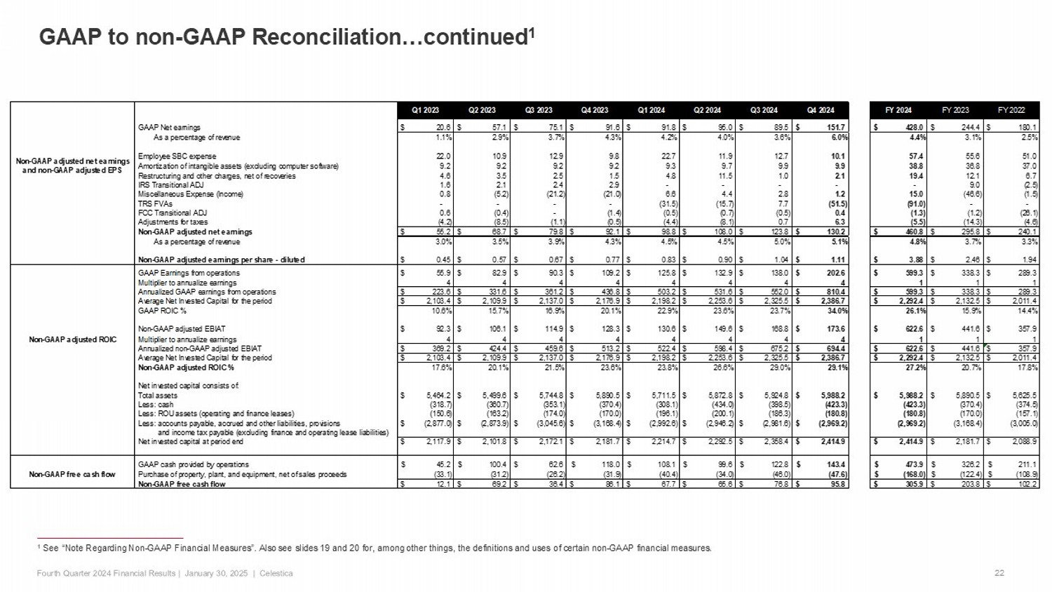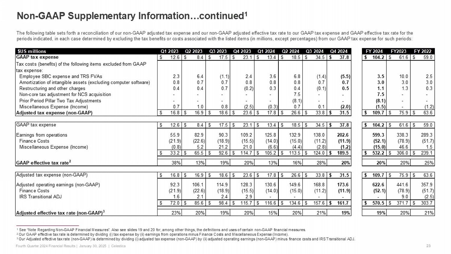 Q1 2023 Q2 2023 Q3 2023 Q4 2023 Q1 2024 Q2 2024 Q3 2024 Q4 2024 FY 2024 FY 2023 FY 2022 GAAP Net earnings 20.6$ 57.1$ 75.1$ 91.6$ 91.8$ 95.0$ 89.5$ 151.7$ 428.0$ 244.4$ 180.1$ As a percentage of revenue 1.1% 2.9% 3.7% 4.3% 4.2% 4.0% 3.6% 6.0% 4.4% 3.1% 2.5% Employee SBC expense 22.0 10.9 12.9 9.8 22.7 11.9 12.7 10.1 57.4 55.6 51.0 Amortization of intangible assets (excluding computer software) 9.2 9.2 9.2 9.2 9.3 9.7 9.9 9.9 38.8 36.8 37.0 Restructuring and other charges, net of recoveries 4.6 3.5 2.5 1.5 4.8 11.5 1.0 2.1 19.4 12.1 6.7 IRS Transitional ADJ 1.6 2.1 2.4 2.9 - - - - - 9.0 (2.5) Miscellaneous Expense (Income) 0.8 (5.2) (21.2) (21.0) 6.6 4.4 2.8 1.2 15.0 (46.6) (1.5) TRS FVAs - - - - (31.5) (15.7) 7.7 (51.5) (91.0) - - FCC Transitional ADJ 0.6 (0.4) - (1.4) (0.5) (0.7) (0.5) 0.4 (1.3) (1.2) (26.1) Adjustments for taxes (4.2) (8.5) (1.1) (0.5) (4.4) (8.1) 0.7 6.3 (5.5) (14.3) (4.6) Non-GAAP adjusted net earnings 55.2$ 68.7$ 79.8$ 92.1$ 98.8$ 108.0$ 123.8$ 130.2$ 460.8$ 295.8$ 240.1$ As a percentage of revenue 3.0% 3.5% 3.9% 4.3% 4.5% 4.5% 5.0% 5.1% 4.8% 3.7% 3.3% Non-GAAP adjusted earnings per share - diluted 0.45$ 0.57$ 0.67$ 0.77$ 0.83$ 0.90$ 1.04$ 1.11$ 3.88$ 2.46$ 1.94$ GAAP Earnings from operations 55.9$ 82.9$ 90.3$ 109.2$ 125.8$ 132.9$ 138.0$ 202.6$ 599.3$ 338.3$ 289.3$ Multiplier to annualize earnings 4 4 4 4 4 4 4 4 1 1 1 Annualized GAAP earnings from operations 223.6$ 331.6$ 361.2$ 436.8$ 503.2$ 531.6$ 552.0$ 810.4$ 599.3$ 338.3$ 289.3$ Average Net Invested Capital for the period 2,103.4$ 2,109.9$ 2,137.0$ 2,176.9$ 2,198.2$ 2,253.6$ 2,325.5$ 2,386.7$ 2,292.4$ 2,132.5$ 2,011.4$ GAAP ROIC % 10.6% 15.7% 16.9% 20.1% 22.9% 23.6% 23.7% 34.0% 26.1% 15.9% 14.4% Non-GAAP adjusted EBIAT 92.3$ 106.1$ 114.9$ 128.3$ 130.6$ 149.6$ 168.8$ 173.6$ 622.6$ 441.6$ 357.9$ Non-GAAP adjusted ROIC Multiplier to annualize earnings 4 4 4 4 4 4 4 4 1 1 1 Annualized non-GAAP adjusted EBIAT 369.2$ 424.4$ 459.6$ 513.2$ 522.4$ 598.4$ 675.2$ 694.4$ 622.6$ 441.6$ 357.9$ Average Net Invested Capital for the period 2,103.4$ 2,109.9$ 2,137.0$ 2,176.9$ 2,198.2$ 2,253.6$ 2,325.5$ 2,386.7$ 2,292.4$ 2,132.5$ 2,011.4$ Non-GAAP adjusted ROIC % 17.6% 20.1% 21.5% 23.6% 23.8% 26.6% 29.0% 29.1% 27.2% 20.7% 17.8% Net invested capital consists of: Total assets 5,464.2$ 5,499.6$ 5,744.8$ 5,890.5$ 5,711.5$ 5,872.8$ 5,924.8$ 5,988.2$ 5,988.2$ 5,890.5$ 5,625.5$ Less: cash (318.7) (360.7) (353.1) (370.4) (308.1) (434.0) (398.5) (423.3) (423.3) (370.4) (374.5) Less: ROU assets (operating and finance leases) (150.6) (163.2) (174.0) (170.0) (196.1) (200.1) (186.3) (180.8) (180.8) (170.0) (157.1) Less: accounts payable, accrued and other liabilities, provisions (2,877.0)$ (2,873.9)$ (3,045.6)$ (3,168.4)$ (2,992.6)$ (2,946.2)$ (2,981.6)$ (2,969.2)$ (2,969.2) (3,168.4) (3,005.0) and income tax payable (excluding finance and operating lease liabilities) Net invested capital at period end 2,117.9$ 2,101.8$ 2,172.1$ 2,181.7$ 2,214.7$ 2,292.5$ 2,358.4$ 2,414.9$ 2,414.9$ 2,181.7$ 2,088.9$ GAAP cash provided by operations 45.2$ 100.4$ 62.6$ 118.0$ 108.1$ 99.6$ 122.8$ 143.4$ 473.9$ 326.2$ 211.1$ Non-GAAP free cash flow Purchase of property, plant, and equipment, net of sales proceeds (33.1) (31.2) (26.2) (31.9) (40.4) (34.0) (46.0) (47.6) (168.0)$ (122.4)$ (108.9)$ Non-GAAP free cash flow 12.1$ 69.2$ 36.4$ 86.1$ 67.7$ 65.6$ 76.8$ 95.8$ 305.9$ 203.8$ 102.2$ Non-GAAP adjusted net earnings and non-GAAP adjusted EPS 1 See “Note Regarding Non - GAAP Financial Measures” . Also see slides 19 and 20 for, among other things, the definitions and uses of certain non - GAAP financial measures . 22 GAAP to non - GAAP Reconciliation…continued 1