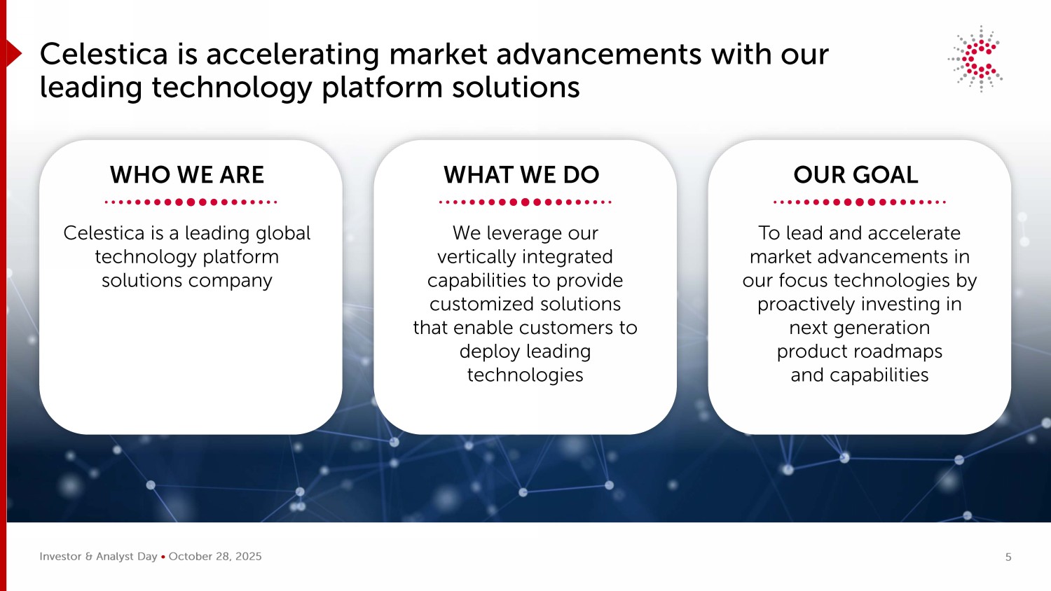 Investor & Analyst Day • October 28, 2025 Celestica is accelerating market advancements with our leading technology platform solutions WHO WE ARE Celestica is a leading global technology platform solutions company We leverage our vertically integrated capabilities to provide customized solutions that enable customers to deploy leading technologies WHAT WE DO To lead and accelerate market advancements in our focus technologies by proactively investing in next generation product roadmaps and capabilities OUR GOAL 5