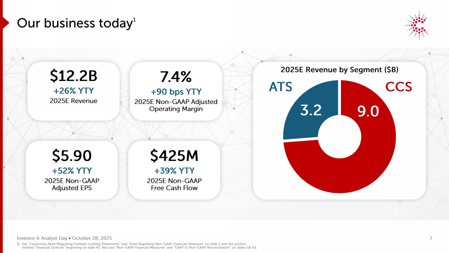 Investor & Analyst Day • October 28, 2025 9.0 3.2 ATS CCS Our business today 1 $12.2B +26% YTY 2025E Revenue $5.90 +52% YTY 2025E Non - GAAP Adjusted EPS $425M +39% YTY 2025E Non - GAAP Free Cash Flow 7.4% +90 bps YTY 2025E Non - GAAP Adjusted Operating Margin 2025E Revenue by Segment ($B) 1) See “Cautionary Note Regarding Forward - Looking Statements” and “Note Regarding Non - GAAP Financial Measures” on slide 2 and the s ection entitled “Financial Outlook” beginning on slide 43. Also see “Non - GAAP Financial Measures” and “GAAP to Non - GAAP Reconciliation” on slides 58 - 62. 7