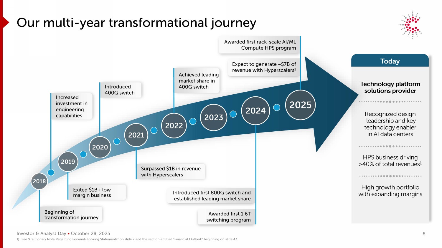 Investor & Analyst Day • October 28, 2025 Technology platform solutions provider Recognized design leadership and key technology enabler in AI data centers HPS business driving >40% of total revenues 1 High growth portfolio with expanding margins Today Beginning of transformation journey Our multi - year transformational journey Increased investment in engineering capabilities Introduced 400G switch Exited $1B+ low margin business Surpassed $1B in revenue with Hyperscalers Achieved leading market share in 400G switch Awarded first 1.6T switching program Introduced first 800G switch and established leading market share Expect to generate ~$7B of revenue with Hyperscalers 1 Awarded first rack - scale AI/ML Compute HPS program 1) See “Cautionary Note Regarding Forward - Looking Statements” on slide 2 and the section entitled “Financial Outlook” beginning on slide 43. 8 2021 2018 2019 2020 2022 2023 2024 2025