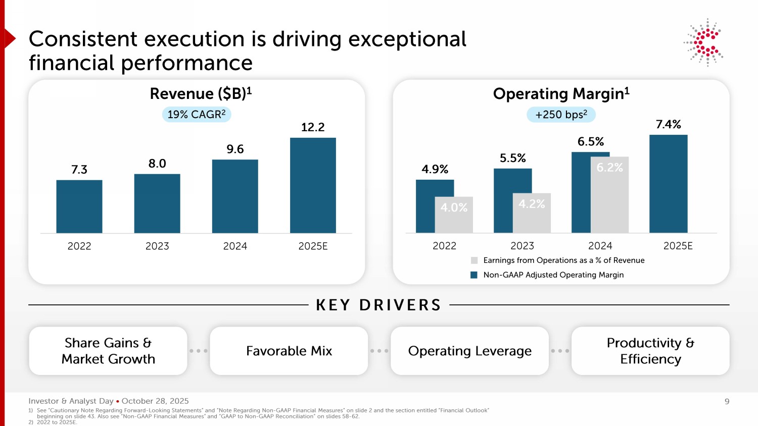 Investor & Analyst Day • October 28, 2025 7.3 8.0 9.6 12.2 2022 2023 2024 2025E Revenue 4.9% 5.5% 6.5% 7.4% 4.0% 4.2% 6.2% 2022 2023 2024 2025E Consistent execution is driving exceptional financial performance KEY DRIVERS Share Gains & Market Growth Productivity & Efficiency Operating Leverage Favorable Mix Revenue ($B) 1 Operating Margin 1 +250 bps 2 19% CAGR 2 Earnings from Operations as a % of Revenue Non - GAAP Adjusted Operating Margin 1) See “Cautionary Note Regarding Forward - Looking Statements” and “Note Regarding Non - GAAP Financial Measures” on slide 2 and the s ection entitled “Financial Outlook” beginning on slide 43. Also see “Non - GAAP Financial Measures” and “GAAP to Non - GAAP Reconciliation” on slides 58 - 62. 2) 2022 to 2025E. 9