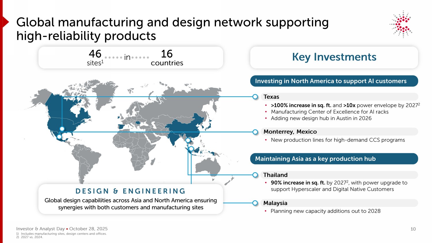 Investor & Analyst Day • October 28, 2025 Key Investments Global manufacturing and design network supporting high - reliability products Investing in North America to support AI customers 46 sites 1 16 countries in • >100% increase in sq. ft. and >10x power envelope by 2027 2 • Manufacturing Center of Excellence for AI racks • Adding new design hub in Austin in 2026 Texas • New production lines for high - demand CCS programs Monterrey, Mexico Maintaining Asia as a key production hub • 90% increase in sq. ft. by 2027 2 , with power upgrade to support Hyperscaler and Digital Native Customers Thailand • Planning new capacity additions out to 2028 Malaysia DESIGN & ENGINEERING Global design capabilities across Asia and North America ensuring synergies with both customers and manufacturing sites 1) Includes manufacturing sites, design centers and offices. 2) 2027 vs. 2024. 10