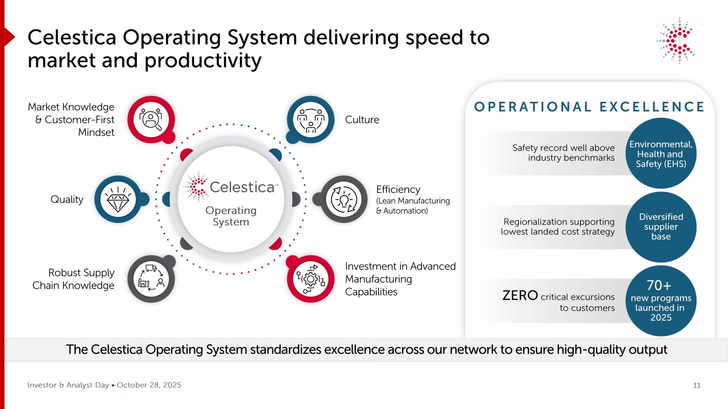 Investor & Analyst Day • October 28, 2025 OPERATIONAL EXCELLENCE Celestica Operating System delivering speed to market and productivity The Celestica Operating System standardizes excellence across our network to ensure high - quality output Operating System Culture Efficiency (Lean Manufacturing & Automation) Investment in Advanced Manufacturing Capabilities Market Knowledge & Customer - First Mindset Quality Robust Supply Chain Knowledge Safety record well above industry benchmarks Environmental, Health and Safety (EHS) ZERO critical excursions to customers 70+ new programs launched in 2025 Regionalization supporting lowest landed cost strategy Diversified supplier base 11