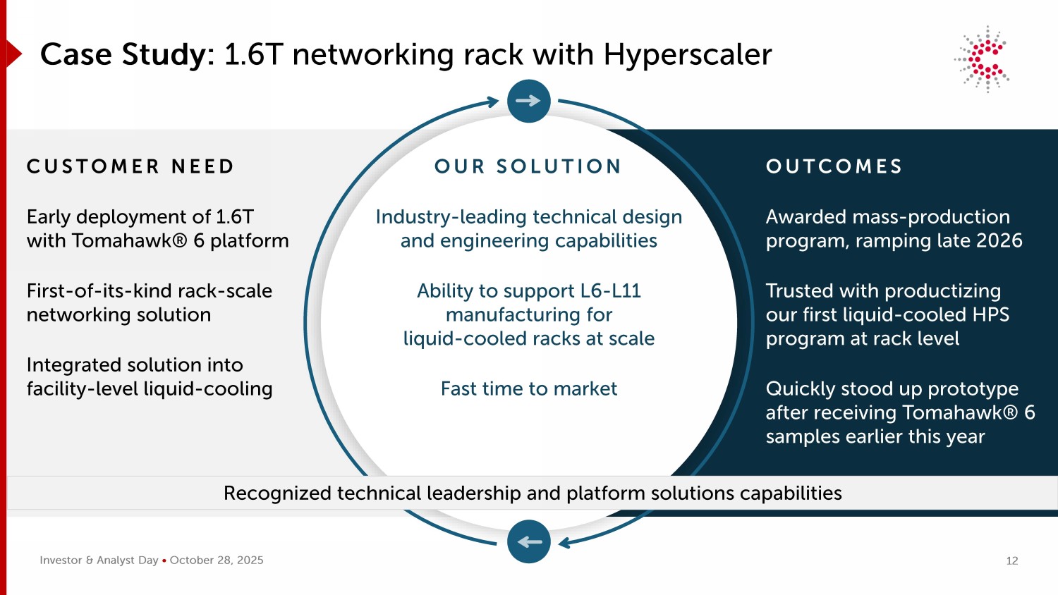 Investor & Analyst Day • October 28, 2025 Case Study: 1.6T networking rack with Hyperscaler CUSTOMER NEED Early deployment of 1.6T with Tomahawk® 6 platform First - of - its - kind rack - scale networking solution Integrated solution into facility - level liquid - cooling OUTCOMES Awarded mass - production program, ramping late 2026 Trusted with productizing our first liquid - cooled HPS program at rack level Quickly stood up prototype after receiving Tomahawk® 6 samples earlier this year OUR SOLUTION Industry - leading technical design and engineering capabilities Ability to support L6 - L11 manufacturing for liquid - cooled racks at scale Fast time to market Recognized technical leadership and platform solutions capabilities 12