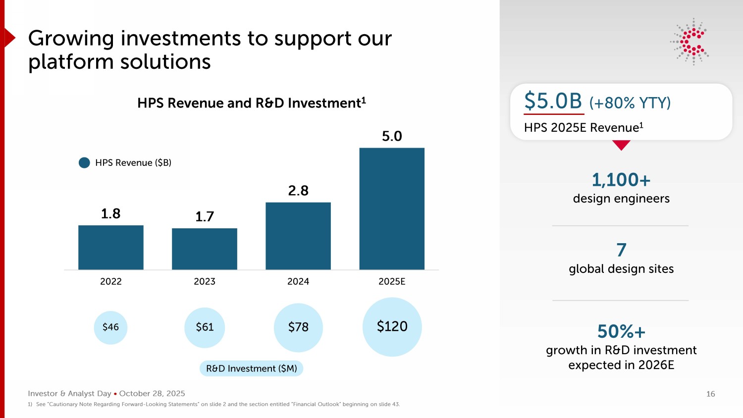 Investor & Analyst Day • October 28, 2025 1.8 1.7 2.8 5.0 2022 2023 2024 2025E Growing investments to support our platform solutions $5.0B (+80% YTY) HPS 2025E Revenue 1 1,100+ design engineers $46 $61 $78 $120 HPS Revenue ($B) HPS Revenue and R&D Investment 1 7 global design sites 50%+ growth in R&D investment expected in 2026E R&D Investment ($M) 1) See “Cautionary Note Regarding Forward - Looking Statements” on slide 2 and the section entitled “Financial Outlook” beginning on slide 43. 16