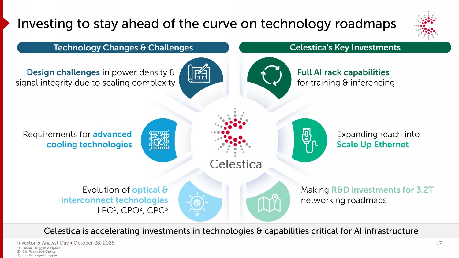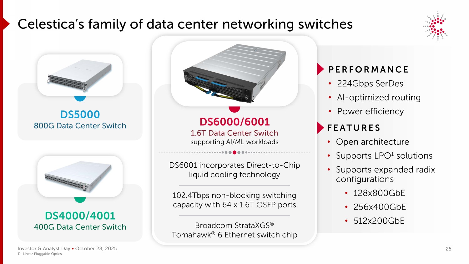 Investor & Analyst Day • October 28, 2025 FEATURES • Open architecture • Supports LPO 1 solutions • Supports expanded radix configurations • 128x800GbE • 256x400GbE • 512x200GbE PERFORMANCE • 224Gbps SerDes • AI - optimized routing • Power efficiency DS6000/6001 1.6T Data Center Switch supporting AI/ML workloads Celestica’s family of data center networking switches DS5000 800G Data Center Switch DS4000/4001 4 00G Data Center Switch DS6001 incorporates Direct - to - Chip liquid cooling technology 102.4Tbps non - blocking switching capacity with 64 x 1.6T OSFP ports Broadcom StrataXGS ® Tomahawk ® 6 Ethernet switch chip 1) Linear Pluggable Optics. 25