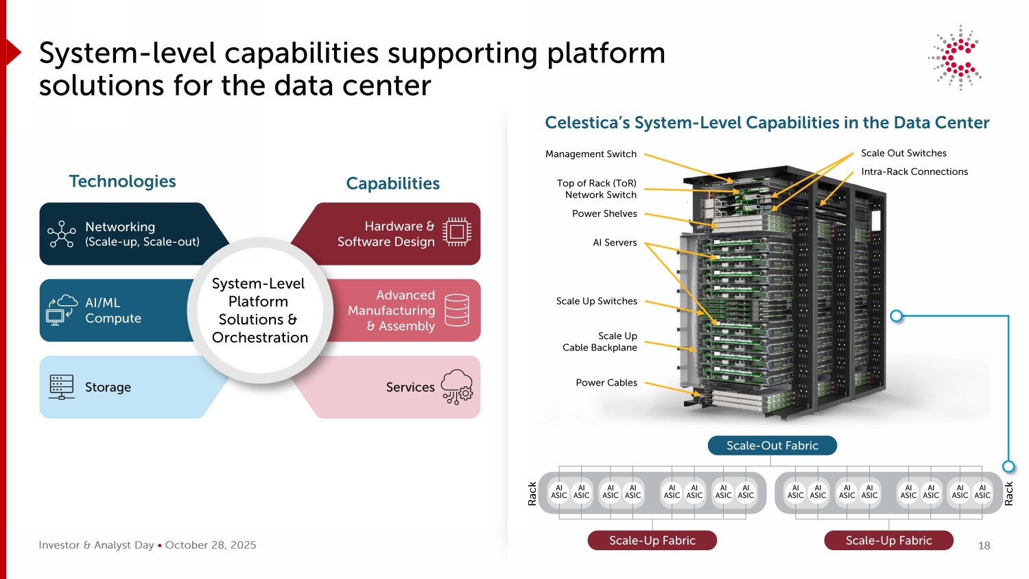 Investor & Analyst Day • October 28, 2025 Scale Up Cable Backplane Management Switch Top of Rack ( ToR ) Network Switch Scale Out Switches Power Shelves Intra - Rack Connections AI Servers Scale Up Switches Power Cables System - level capabilities supporting platform solutions for the data center Celestica’s System - Level Capabilities in the Data Center Advanced Manufacturing & Assembly AI/ML Compute Services Storage Hardware & Software Design Networking (Scale - up, Scale - out) System - Level Platform Solutions & Orchestration Technologies Capabilities AI ASIC AI ASIC AI ASIC AI ASIC AI ASIC AI ASIC AI ASIC AI ASIC AI ASIC AI ASIC AI ASIC AI ASIC AI ASIC AI ASIC AI ASIC AI ASIC Scale - Out Fabric Scale - Up Fabric Scale - Up Fabric Rack Rack 18