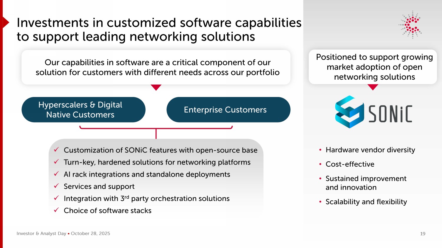 Investor & Analyst Day • October 28, 2025 Enterprise Customers Investments in customized software capabilities to support leading networking solutions Our capabilities in software are a critical component of our solution for customers with different needs across our portfolio • Hardware vendor diversity • Cost - effective • Sustained improvement and innovation • Scalability and flexibility Hyperscalers & Digital Native Customers Positioned to support growing market adoption of open networking solutions x Customization of SONiC features with open - source base x Turn - key, hardened solutions for networking platforms x AI rack integrations and standalone deployments x Services and support x Integration with 3 rd party orchestration solutions x Choice of software stacks 19
