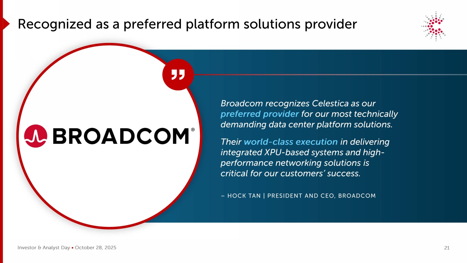 Investor & Analyst Day • October 28, 2025 Recognized as a preferred platform solutions provider 21 Broadcom recognizes Celestica as our preferred provider for our most technically demanding data center platform solutions. Their world - class execution in delivering integrated XPU - based systems and high - performance networking solutions is critical for our customers’ success. – HOCK TAN | PRESIDENT AND CEO, BROADCOM