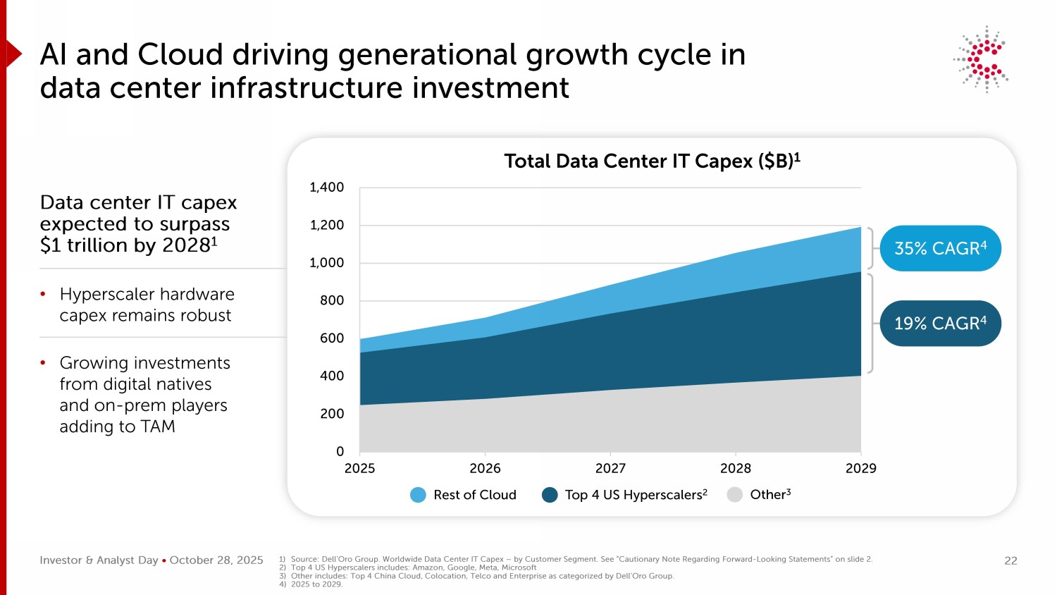 Investor & Analyst Day • October 28, 2025 0 200 400 600 800 1,000 1,200 1,400 2025 2026 2027 2028 2029 AI and Cloud driving generational growth cycle in data center infrastructure investment Data center IT capex expected to surpass $1 trillion by 2028 1 • Hyperscaler hardware capex remains robust • Growing investments from digital natives and on - prem players adding to TAM Total Data Center IT Capex ($B) 1 35 % CAGR 4 Top 4 US Hyperscalers 2 Rest of Cloud Other 3 19 % CAGR 4 1) Source: Dell’Oro Group. Worldwide Data Center IT Capex – by Customer Segment. See “Cautionary Note Regarding Forward - Looking Statements” on slid e 2. 2) Top 4 US Hyperscalers includes: Amazon, Google, Meta, Microsoft 3) Other includes: Top 4 China Cloud, Colocation, Telco and Enterprise as categorized by Dell’Oro Group. 4) 2025 to 2029. 22