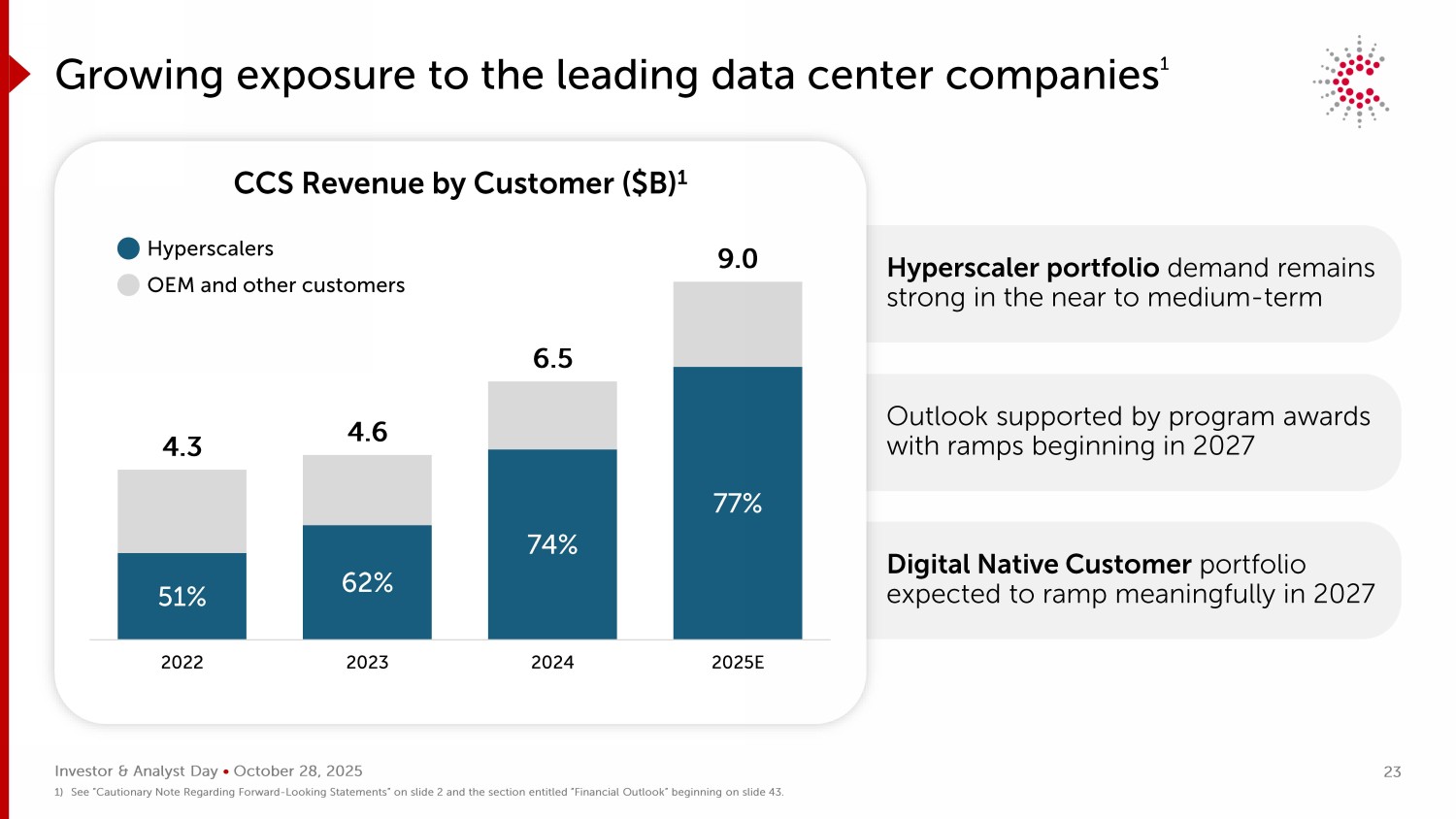 Investor & Analyst Day • October 28, 2025 Cautionary Note Regarding Forward - Looking Statements This presentation contains forward - looking statements, including, without limitation, those related to: strengthening demand in our businesses, demand environment and customer forecasts, our anticipated financial and/or operational results, guidance and outlook, including statements under the headings “Q4 2025 Guidance,” “Q4 2025 Non - GAAP Tax Rate Estimate,” “Q4 2025 End Mark et Revenue Outlook” and “2025 Annual Outlook” and in the sections entitled "Future Ready: Accelerating Market Advancements," "Connectivity & Cloud Solutions," "Advanced Technology Solutions" and "Financial Outlook," market opportunitie s a nd investments in technology platforms and roadmaps, expected research and development (R&D) and other capital expenditures, increased recruiting and operational resources, our intention to launch a new Normal Course Issuer Bid (NCIB) a nd its anticipated terms, developments related to new customer wins, timing of production ramps, deliveries and availabilities of certain key components, anticipated economic conditions, industry and market trends and projections, underlying market gro wth rates, customer demand, our market share and positioning, prospects and opportunities, and strategic initiatives. Such forward - looking statements may, without limitation, be preceded by, followed by, or include words such as "believes," "expects," "anticipates," "estimates," "intends," "plans," "continues," "project," "target," "outlook," "goal," "guidance," "potential," "possible," "contemplate," "seek," or similar expressions, or may employ such future or conditional verbs as "may," "might," "wi ll," "could," "should," or "would," or may otherwise be indicated as forward - looking statements by grammatical construction, phrasing or context. For those statements, we claim the protection of the safe harbor for forward - looking statements contained i n the U.S. Private Securities Litigation Reform Act of 1995, where applicable, and for forward - looking information under applicable Canadian securities laws. Forward - looking statements are provided to assist readers in understanding management's current expectations and plans relating to the future. Forward - looking statements reflect our current estimates, beliefs and assumptions, which are based on management's perception of historic trends, current conditions and expected future developments, as well as other factors it bel ieves are appropriate in the circumstances, including certain assumptions about anticipated CCS and ATS revenue growth; anticipated demand levels across our businesses, including new programs; anticipated technology upgrade cycles; our ability t o r etain programs and customers; program and production ramps to occur as anticipated; continuing operating leverage and improving mix; the impact of anticipated market conditions on our businesses; the reliability of third party market forecasts an d customer indications of future demands, including with respect to data center infrastructure; tax and interest rates; cont inu ed advancement and commercialization of artificial intelligence (AI) technologies and cloud computing; supporting sustained high le vels of capital expenditure investments by leading hyperscaler , AI, and data center customers; our ability develop new capabilities; scaling of our operations to meet the anticipated growth in customer demand; the economy; our customers; our su ppl iers; no material changes to tariffs or trade restrictions compared to what are in effect as of October 27, 2025; that our customers will retain liability for and we will be able to recover substantially all costs from customers relating to product /co mponent tariffs and countermeasures; no material changes in business activities resulting from current macroeconomic trends a nd uncertainties, including evolving global tariff and trade negotiations; our ability to achieve our strategic goals; the avail abi lity of capital resources for, and the permissibility under our credit facility of, repurchases of outstanding Common Shares und er our current NCIB, acceptance of a new NCIB and compliance with applicable laws and regulations pertaining to NCIBs; as well as ot her market, financial and operational assumptions. Readers are cautioned that such information may not be appropriate for other purposes. Readers should not place undue reliance on such forward - looking information. Forward - looking statements are not guarantees of future performance and are subject to risks that could cause actual results to differ materially from those expressed or implied in such forward - looking statements, including, among others, risks related to: customer and segment concentration; reduction in customer revenue; erosion in customer market competitiveness; changing r eve nue mix and margins; uncertain market, industry, political and economic conditions; customer requests to transfer manufacturing of products from one facility to another; changes to policies or legislation; operational challenges such as in ven tory management and materials and supply chain constraints; and program ramps; the cyclical nature and/or volatility of certa in of our businesses; talent management and inefficient employee utilization; risks related to the expansion or consolidation of ou r operations; cash flow, revenue, and operating results, and tax and interest variability; technology and IT disruption; incr eas ing legal, tax and regulatory complexity and uncertainty (including in relation to our or our customers' businesses); integrating an d achieving the anticipated benefits from acquisitions; and the potential adverse impacts of events outside of our control. For more exhaustive information on the foregoing and other material risks, uncertainties and assumptions readers should refer to our public filings at www.sedarplus.ca and www.sec.gov, includi
