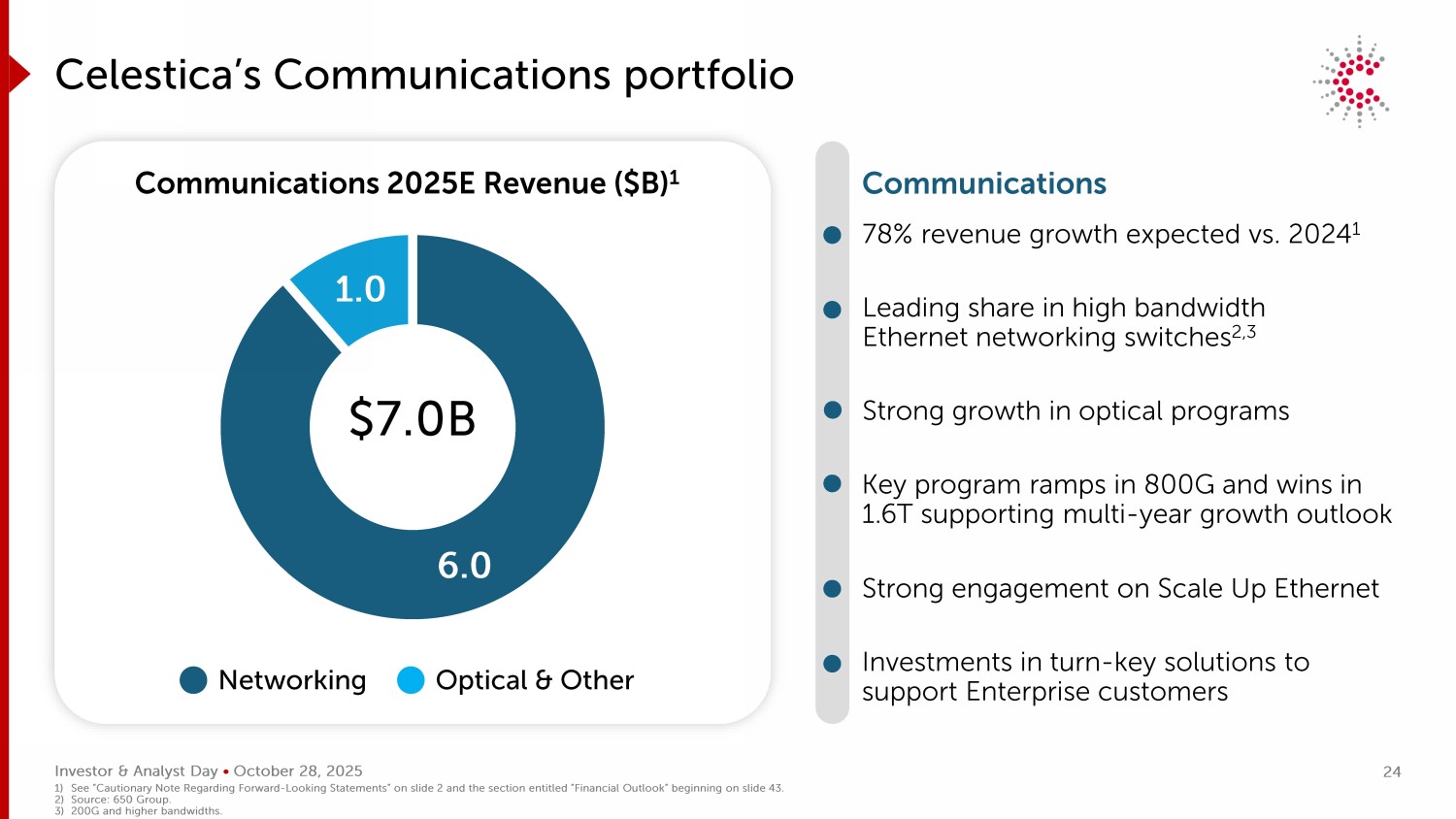 Investor & Analyst Day • October 28, 2025 6.0 1.0 Celestica’s Communications portfolio Communications 2025E Revenue ($B) 1 Networking Optical & Other $7 .0 B Leading share in high bandwidth Ethernet networking switches 2,3 Key program ramps in 800G and wins in 1.6T supporting multi - year growth outlook Strong engagement on Scale Up Ethernet Strong growth in optical programs Investments in turn - key solutions to support Enterprise customers 78% revenue growth expected vs. 2024 1 Communications 1) See “Cautionary Note Regarding Forward - Looking Statements” on slide 2 and the section entitled “Financial Outlook” beginning on slide 43. 2) Source: 650 Group. 3) 200G and higher bandwidths. 24
