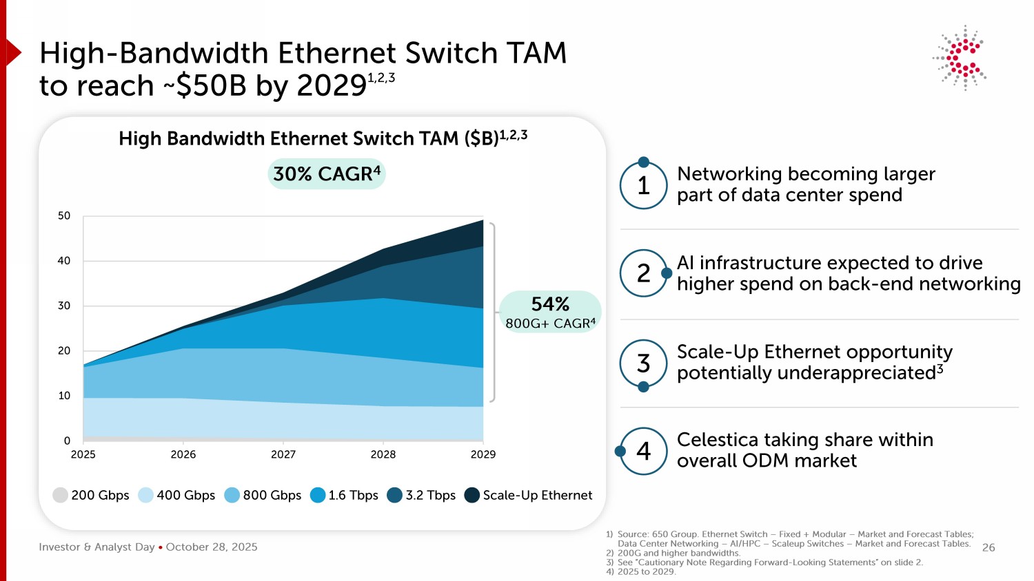 Investor & Analyst Day • October 28, 2025 0 10 20 30 40 50 2025 2026 2027 2028 2029 High - Bandwidth Ethernet Switch TAM to reach ~ $50B by 2029 1,2,3 High Bandwidth Ethernet Switch TAM ($B) 1,2,3 1 Networking becoming larger part of data center spend 2 AI infrastructure expected to drive higher spend on back - end networking 3 Scale - Up Ethernet opportunity potentially underappreciated 3 4 Celestica taking share within overall ODM market 30% CAGR 4 54 % 800G+ CAGR 4 400 Gbps 800 Gbps 1.6 Tbps 3.2 Tbps Scale - Up Ethernet 200 Gbps 1) Source: 650 Group. Ethernet Switch – Fixed + Modular – Market and Forecast Tables; Data Center Networking – AI/HPC – Scaleup Switches – Market and Forecast Tables. 2) 200G and higher bandwidths. 3) See “Cautionary Note Regarding Forward - Looking Statements” on slide 2. 4) 2025 to 2029. 26