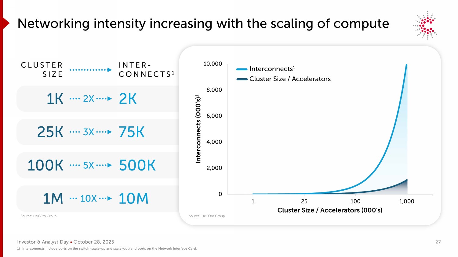Investor & Analyst Day • October 28, 2025 Networking intensity increasing with the scaling of compute CLUSTER SIZE INTER - CONNECTS 1 1K 2K 25K 75K 100K 500K 2X 3X 5X 10X 1M 10M 0 2,000 4,000 6,000 8,000 10,000 1 25 100 1,000 Interconnects (000’s) 1 Cluster Size / Accelerators (000's) Interconnects 1 Cluster Size / Accelerators 1) Interconnects include ports on the switch (scale - up and scale - out) and ports on the Network Interface Card. Source: Dell’Oro Group Source: Dell’Oro Group 27