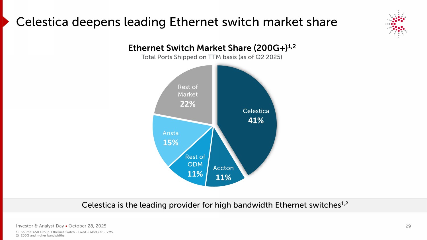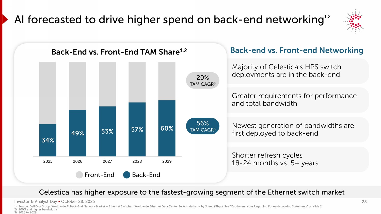 Investor & Analyst Day • October 28, 2025 34% 49% 53% 57% 60% 2025 2026 2027 2028 2029 Back - End vs. Front - End TAM Share 1,2 AI forecasted to drive higher spend on back - end networking 1,2 Front - End Back - End Greater requirements for performance and total bandwidth Majority of Celestica’s HPS switch deployments are in the back - end Newest generation of bandwidths are first deployed to back - end 56% TAM CAGR 3 20% TAM CAGR 3 Celestica has higher exposure to the fastest - growing segment of the Ethernet switch market Shorter refresh cycles 18 - 24 months vs. 5+ years Back - end vs. Front - end Networking 1) Source: Dell’Oro Group. Worldwide AI Back - End Network Market – Ethernet Switches; Worldwide Ethernet Data Center Switch Market – by Speed (Gbps) . See “Cautionary Note Regarding Forward - Looking Statements” on slide 2. 2) 200G and higher bandwidths. 3) 2025 to 2029. 28