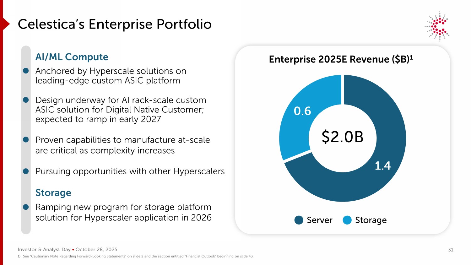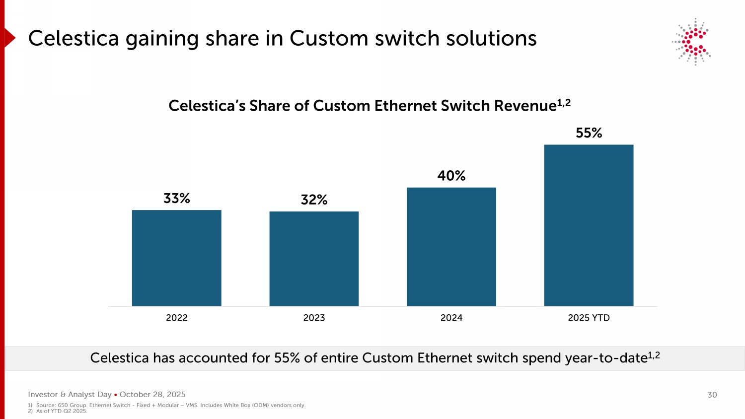 Investor & Analyst Day • October 28, 2025 Celestica gaining share in Custom switch solutions Celestica has accounted for 55% of entire Custom Ethernet switch spend year - to - date 1,2 Celestica’s Share of Custom Ethernet Switch Revenue 1,2 33% 32% 40% 55% 2022 2023 2024 2025 YTD 1) Source: 650 Group. Ethernet Switch - Fixed + Modular – VMS. Includes White Box (ODM) vendors only. 2) As of YTD Q2 2025. 30