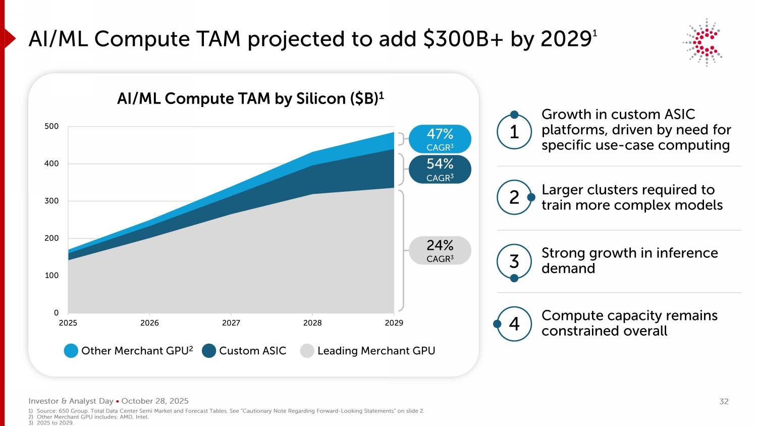 Investor & Analyst Day • October 28, 2025 0 100 200 300 400 500 2025 2026 2027 2028 2029 AI/ML Compute TAM projected to add $300B+ by 2029 1 AI/ML Compute TAM by Silicon ($B) 1 1 Growth in custom ASIC platforms, driven by need for specific use - case computing 2 Larger clusters required to train more complex models 3 Strong growth in inference demand 4 Compute capacity remains constrained overall Other Merchant GPU 2 Custom ASIC Leading Merchant GPU 54% CAGR 3 24% CAGR 3 1) Source: 650 Group. Total Data Center Semi Market and Forecast Tables. See “Cautionary Note Regarding Forward - Looking Statements” on slide 2. 2) Other Merchant GPU includes: AMD, Intel. 3) 2025 to 2029. 47% CAGR 3 32