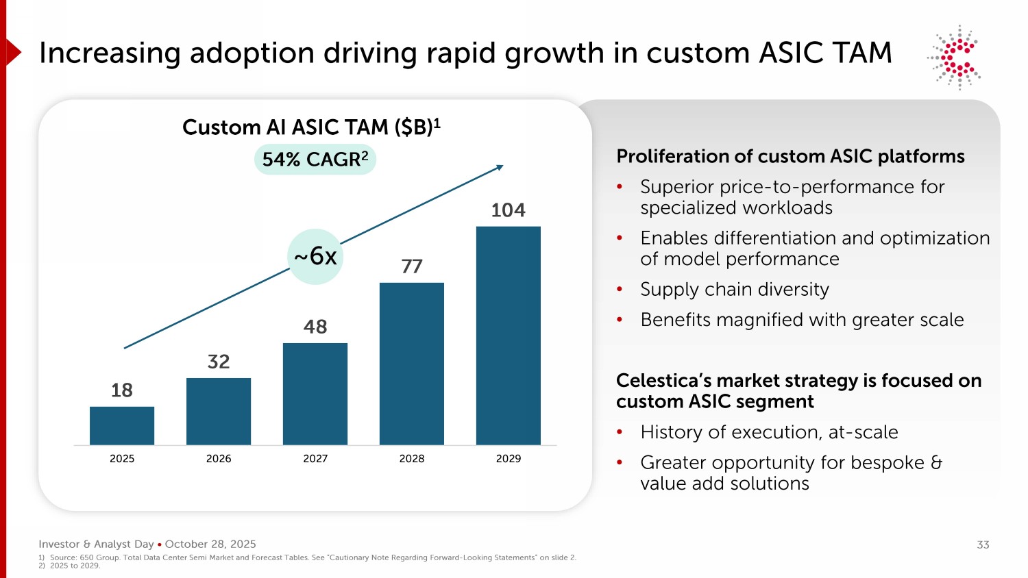 Investor & Analyst Day • October 28, 2025 Increasing adoption driving rapid growth in custom ASIC TAM Proliferation of custom ASIC platforms • Superior price - to - performance for specialized workloads • Enables differentiation and optimization of model performance • Supply chain diversity • Benefits magnified with greater scale Celestica’s market strategy is focused on custom ASIC segment • History of execution, at - scale • Greater opportunity for bespoke & value add solutions Custom AI ASIC TAM ($B) 1 18 32 48 77 104 2025 2026 2027 2028 2029 54% CAGR 2 ~6x 1) Source: 650 Group. Total Data Center Semi Market and Forecast Tables. See “Cautionary Note Regarding Forward - Looking Statements” on slide 2. 2) 2025 to 2029. 33