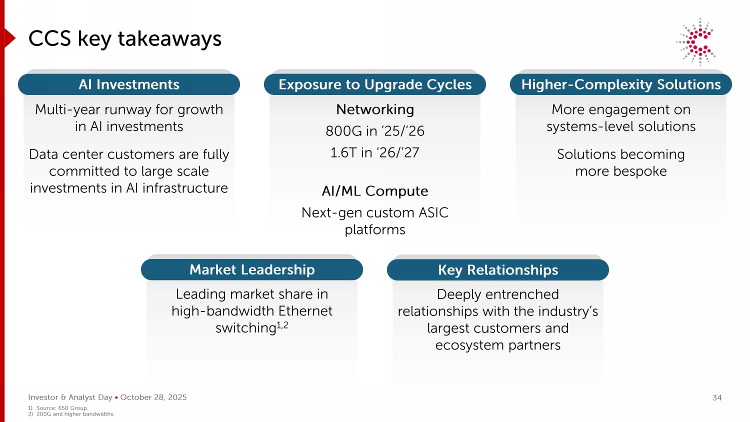 Investor & Analyst Day • October 28, 2025 Leading market share in high - bandwidth Ethernet switching 1,2 Market Leadership Deeply entrenched relationships with the industry’s largest customers and ecosystem partners Key Relationships Multi - year runway for growth in AI investments Data center customers are fully committed to large scale investments in AI infrastructure CCS key takeaways AI Investments Networking 800G in ’25/’26 1.6T in ‘26/’27 AI/ML Compute Next - gen custom ASIC platforms Exposure to Upgrade Cycles More engagement on systems - level solutions Solutions becoming more bespoke Higher - Complexity Solutions 1) Source: 650 Group. 2) 200G and higher bandwidths. 34