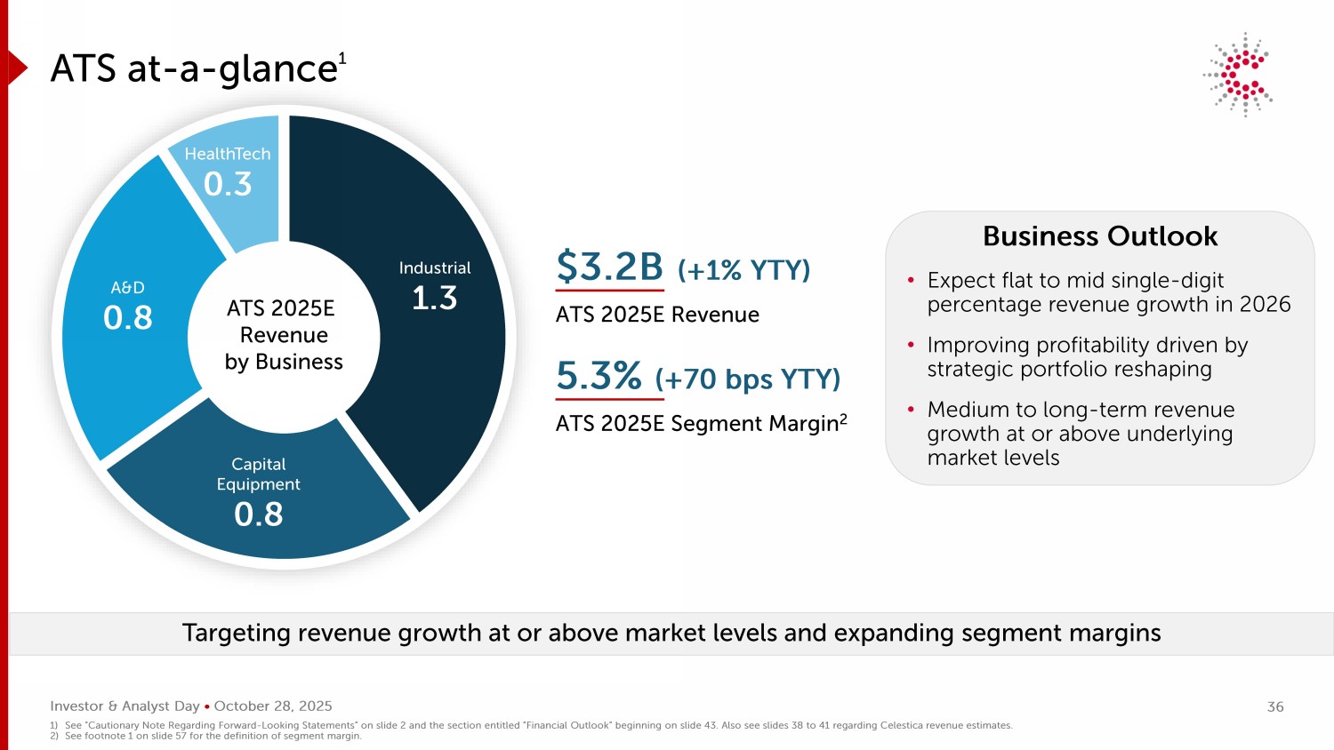 Investor & Analyst Day • October 28, 2025 ATS at - a - glance 1 Targeting revenue growth at or above market levels and expanding segment margins Industrial 1.3 Capital Equipment 0.8 A&D 0.8 HealthTech 0.3 ATS 2025E Revenue by Business $3.2B (+1% YTY) ATS 2025E Revenue 5.3% (+70 bps YTY) ATS 2025E Segment Margin 2 Business Outlook • Expect flat to mid single - digit percentage revenue growth in 2026 • Improving profitability driven by strategic portfolio reshaping • Medium to long - term revenue growth at or above underlying market levels 1) See “Cautionary Note Regarding Forward - Looking Statements” on slide 2 and the section entitled “Financial Outlook” beginning on slide 43. Also see slides 38 to 41 regarding Celestica revenue estimates. 2) See footnote 1 on slide 57 for the definition of segment margin. 36