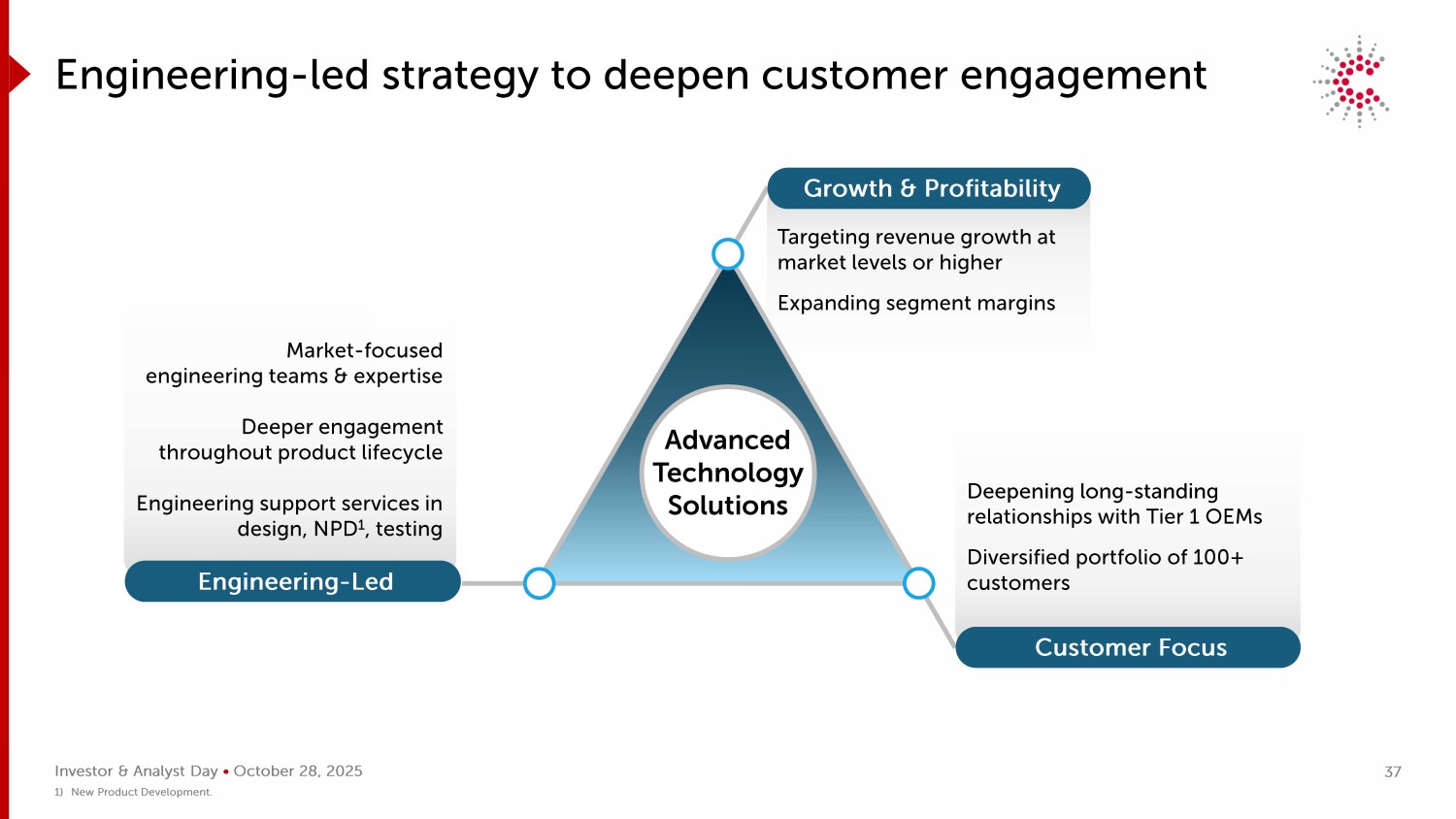 Investor & Analyst Day • October 28, 2025 Targeting revenue growth at market levels or higher Expanding segment margins Deepening long - standing relationships with Tier 1 OEMs Diversified portfolio of 100+ customers Market - focused engineering teams & expertise Deeper engagement throughout product lifecycle Engineering support services in design, NPD 1 , testing Engineering - led strategy to deepen customer engagement Customer Focus Engineering - Led Growth & Profitability Advanced Technology Solutions 1) New Product Development. 37