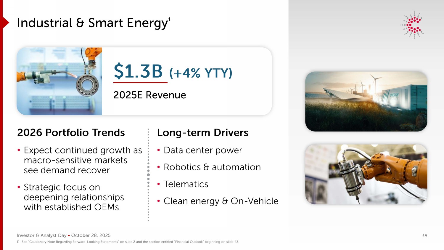 Investor & Analyst Day • October 28, 2025 Industrial & Smart Energy 1 2026 Portfolio Trends • Expect continued growth as macro - sensitive markets see demand recover • Strategic focus on deepening relationships with established OEMs Long - term Drivers • Data center power • Robotics & automation • Telematics • Clean energy & On - Vehicle $1.3B (+ 4 % YTY) 2025E Revenue 1) See “Cautionary Note Regarding Forward - Looking Statements” on slide 2 and the section entitled “Financial Outlook” beginning on slide 43. 38